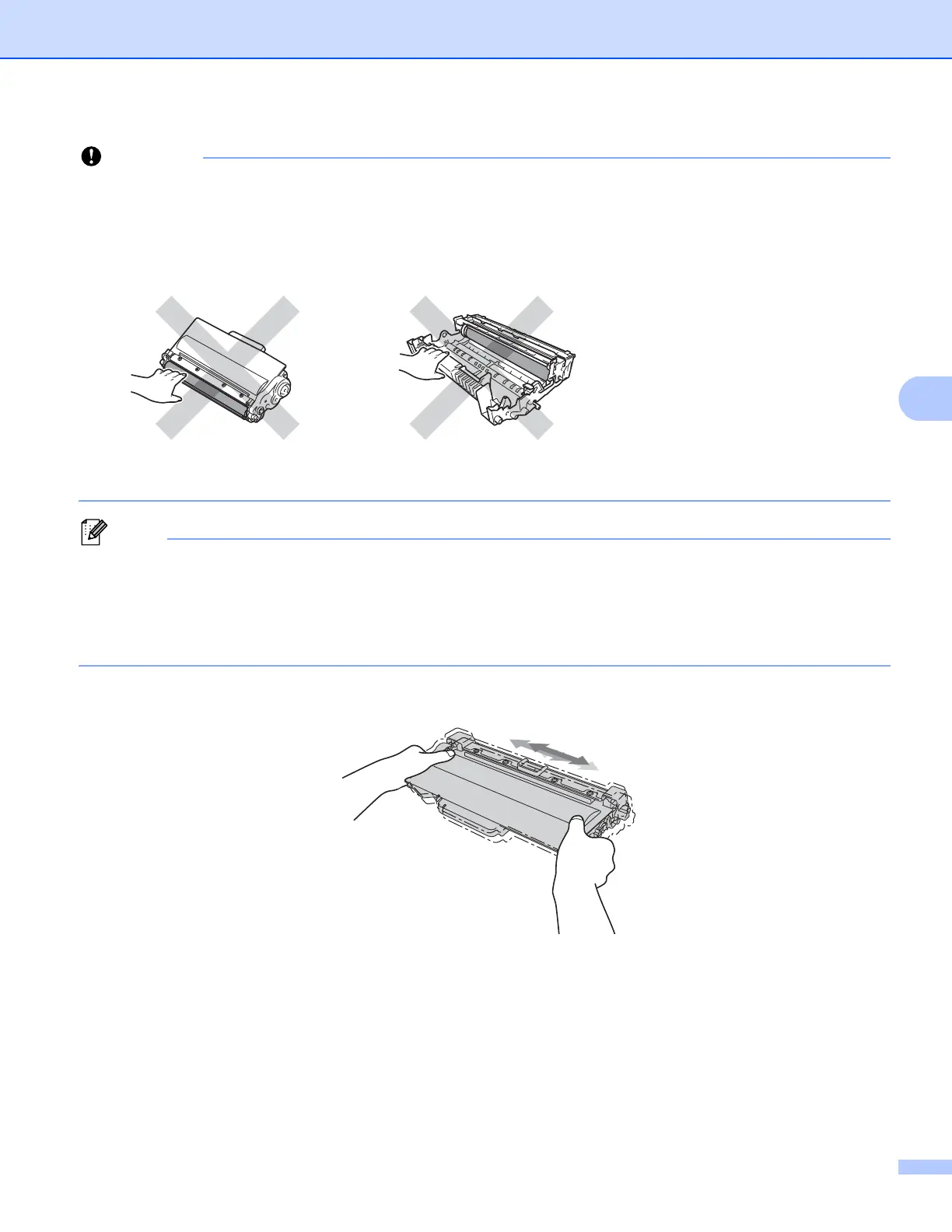 e Unpack the new toner cartridge. Hold the cartridge level with both hands and gently shake it from side