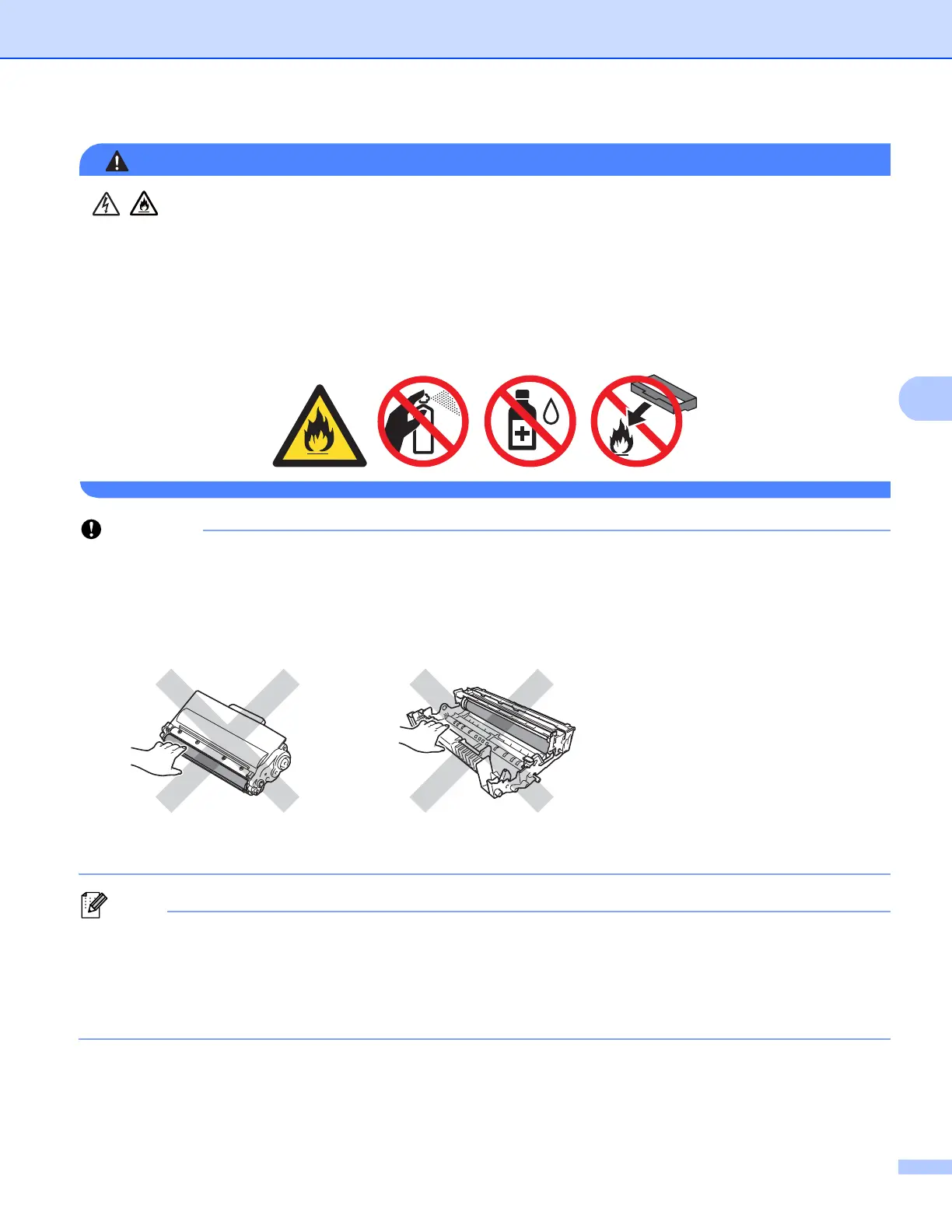 • DO NOT put a toner cartridge or a toner cartridge and drum unit assembly into a fire. It could explode,