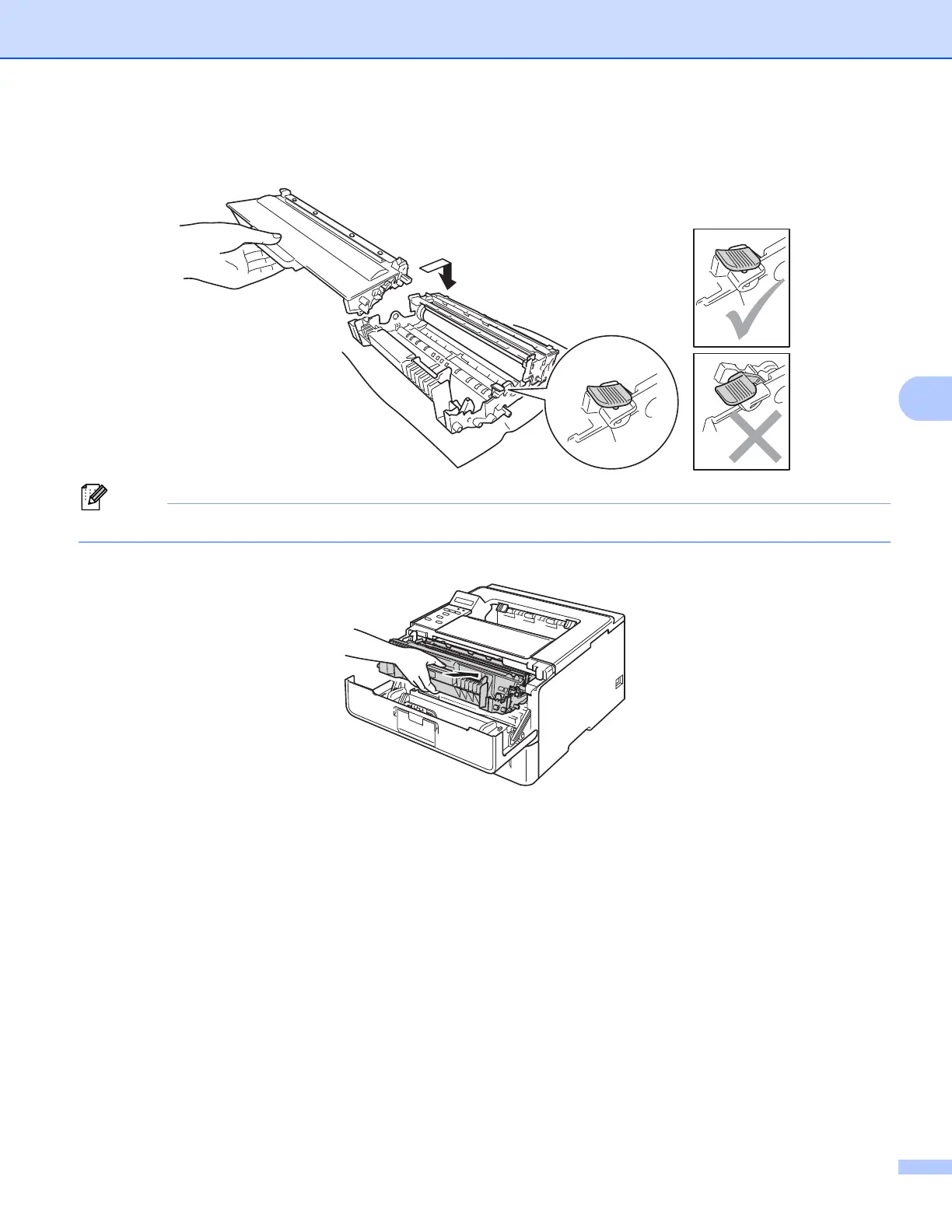 m Put the toner cartridge back into the drum unit until you hear it lock into place. If you put the cartridge in