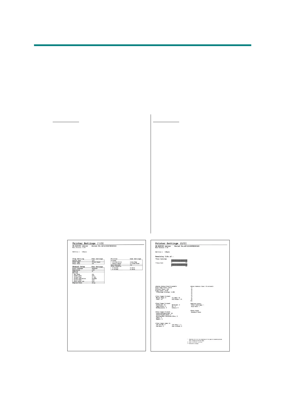 Printer Settings can be printed. The title, model name and serial number are printed on all
