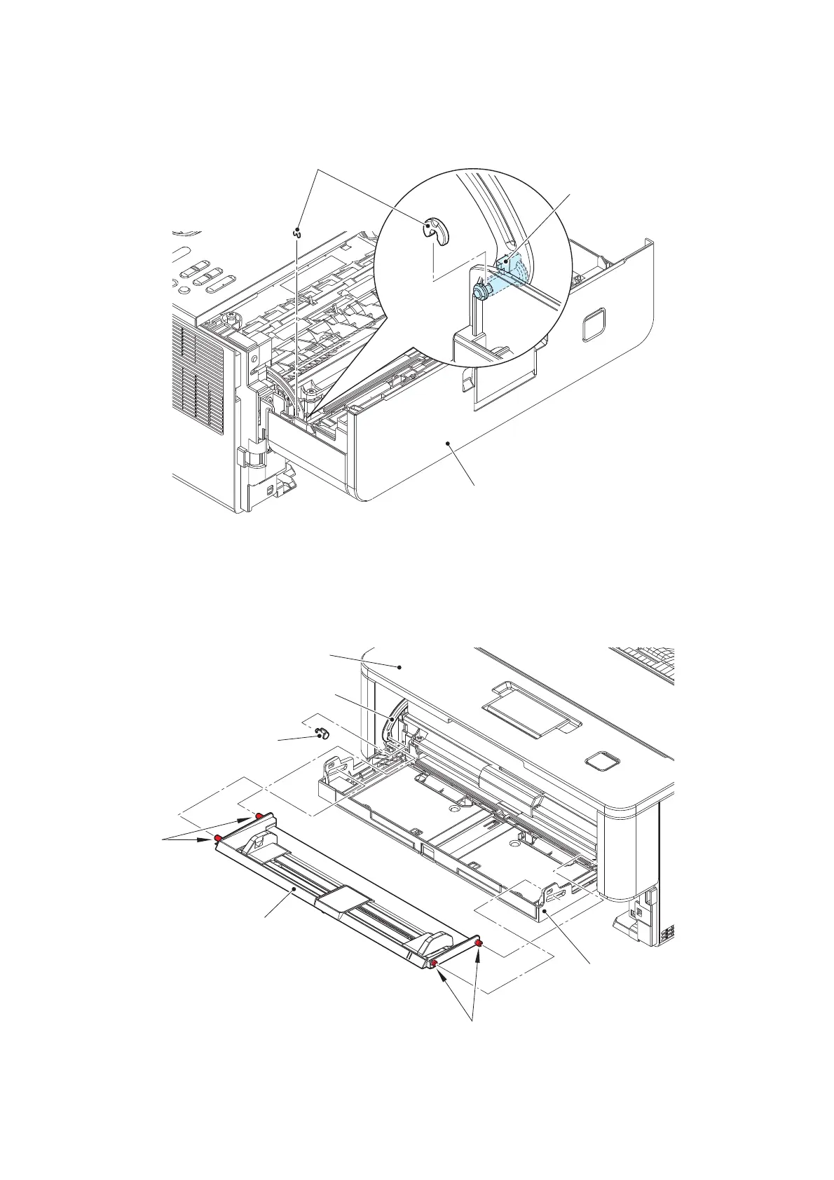 (2) Close the Front cover ASSY. Open the MP tray, and release each Boss and remove the MP