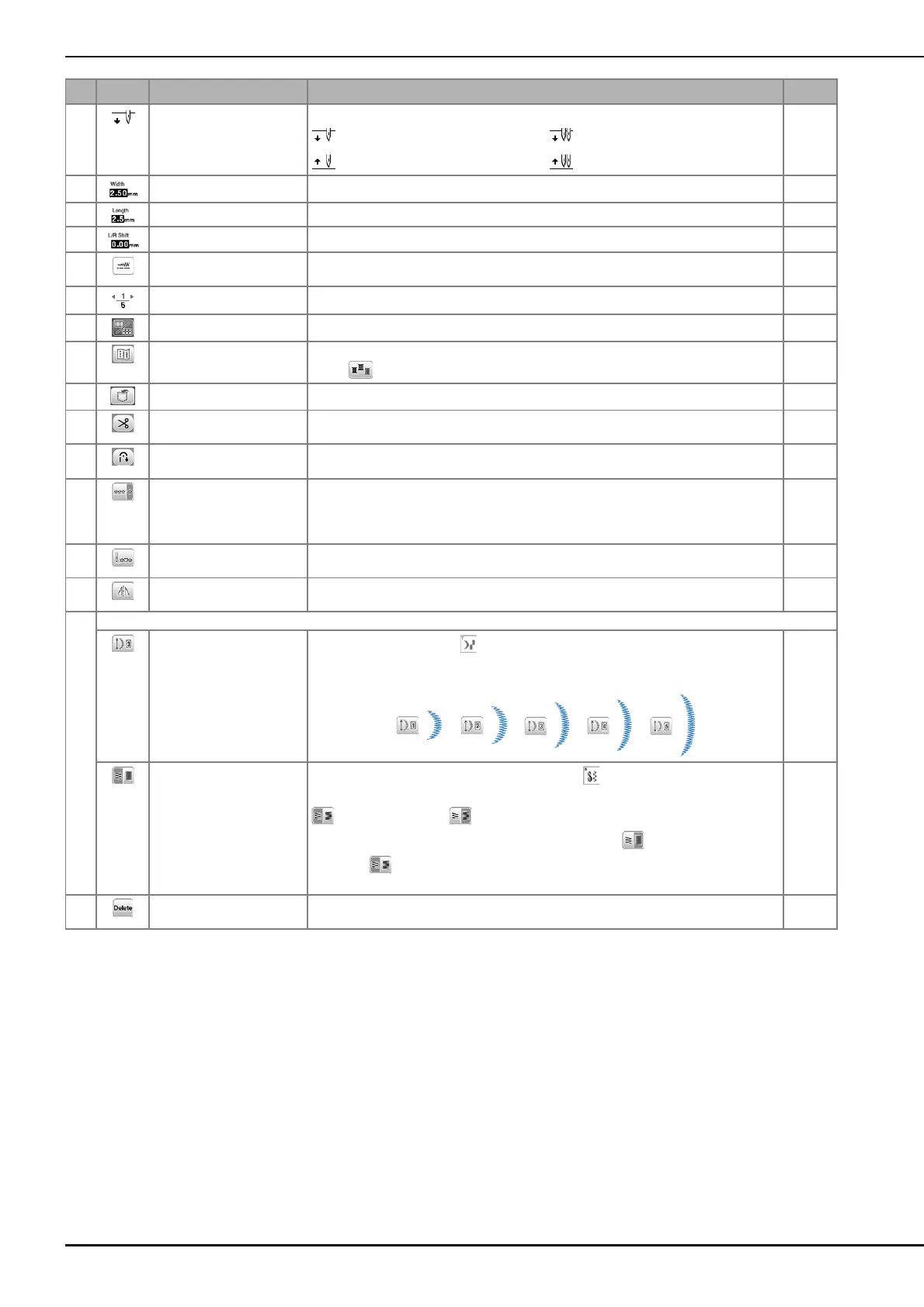 J Delete key Touch this key to delete the selected stitch pattern. When you make a mistake in