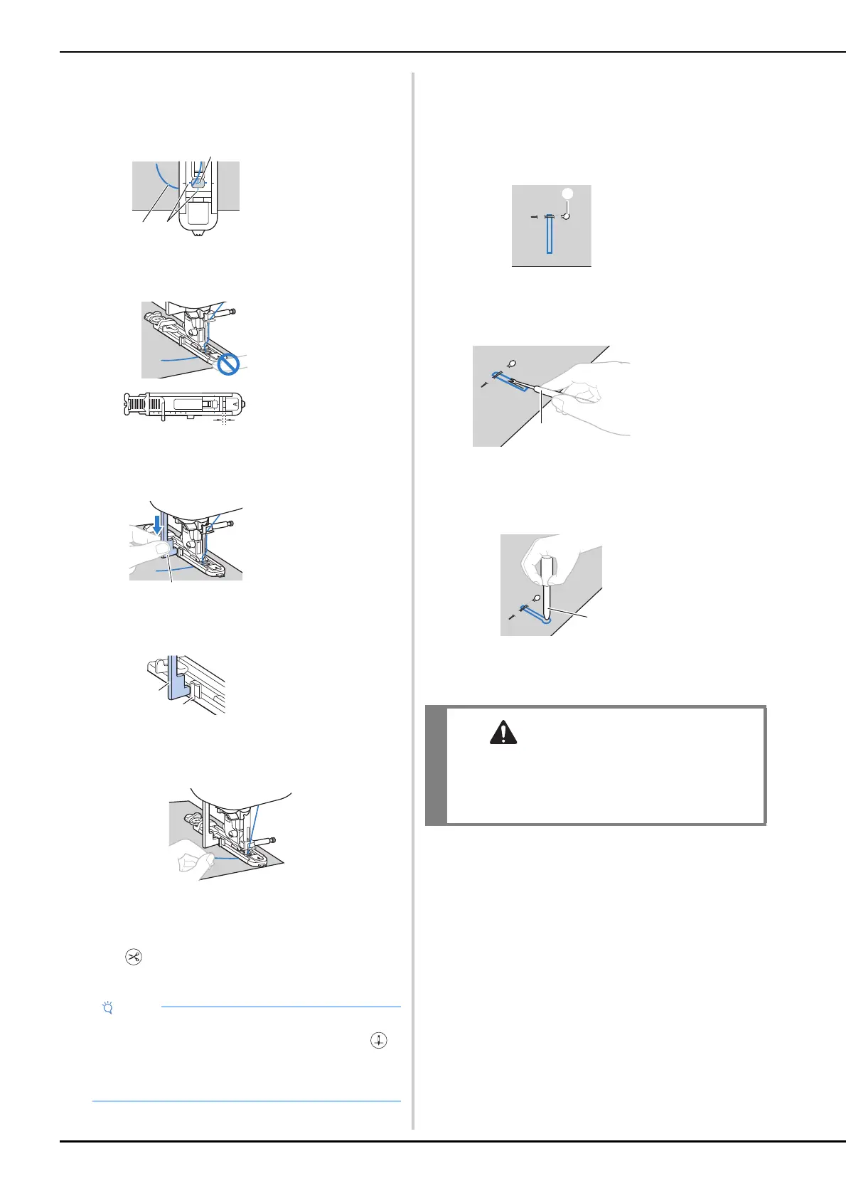 • When lowering the presser foot, do not push in the