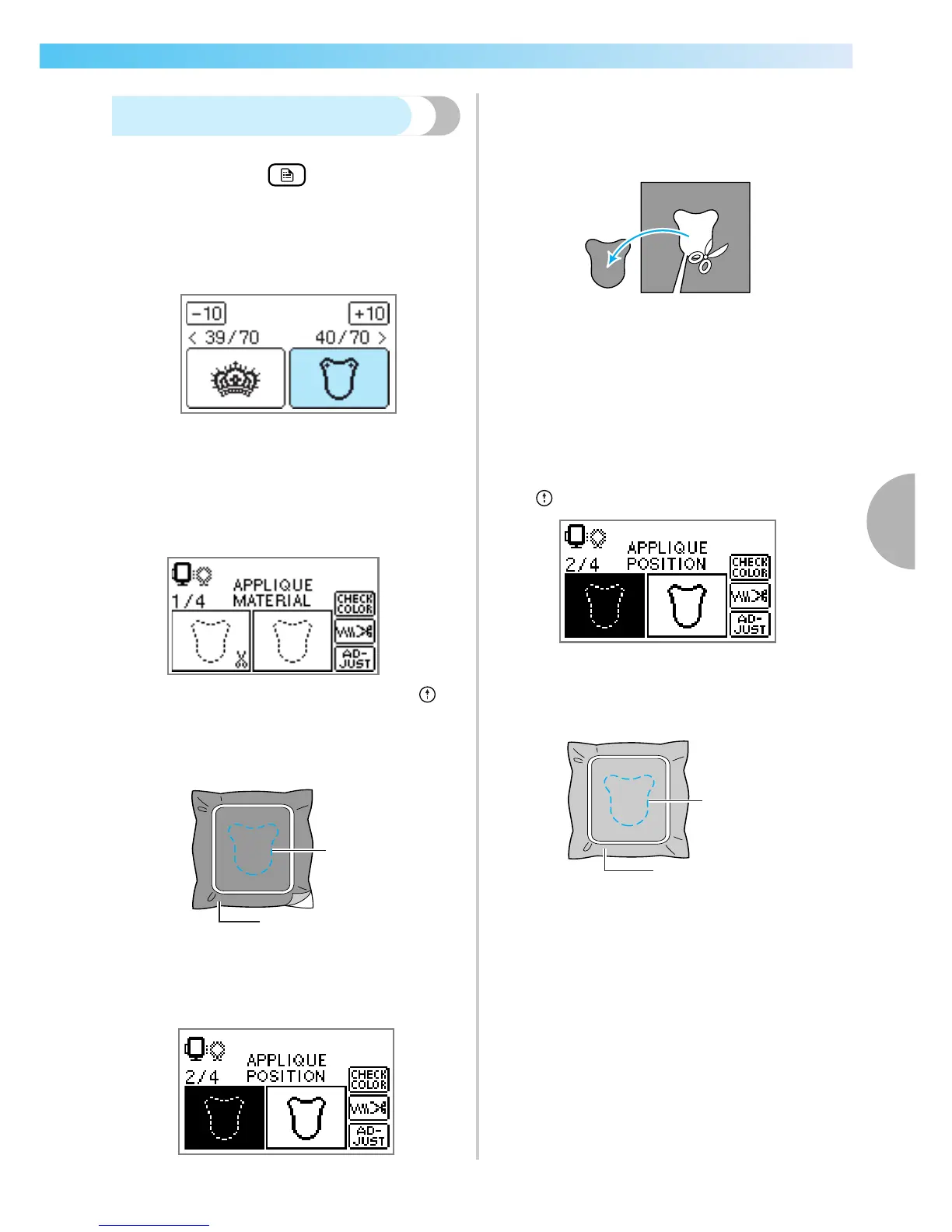 the sewing machine stops. "APPLIQUE" will