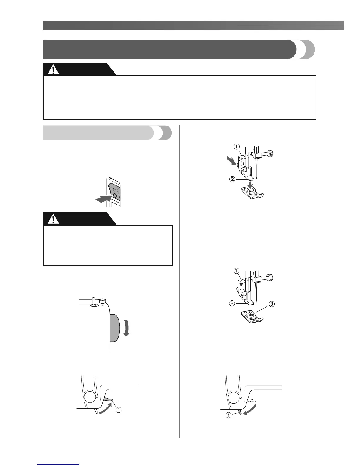 ● Always turn off the power before you change the presser foot. If you leave the power on and step on the