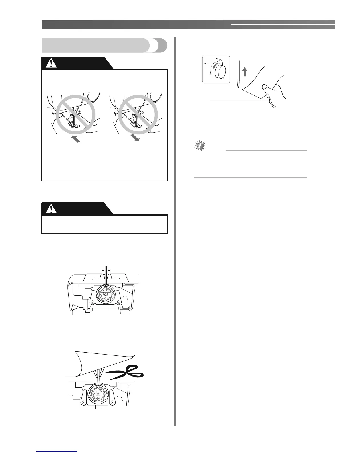 ● Do not turn the handwheel and pull the fabric