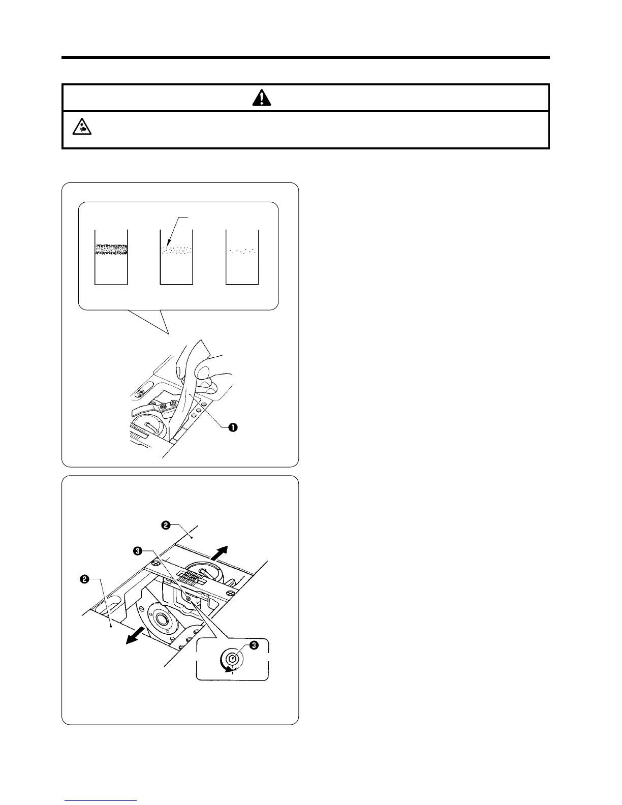 When checking the rotary hook lubrication, do not touch moving parts such as the rotary hook, needle and needle