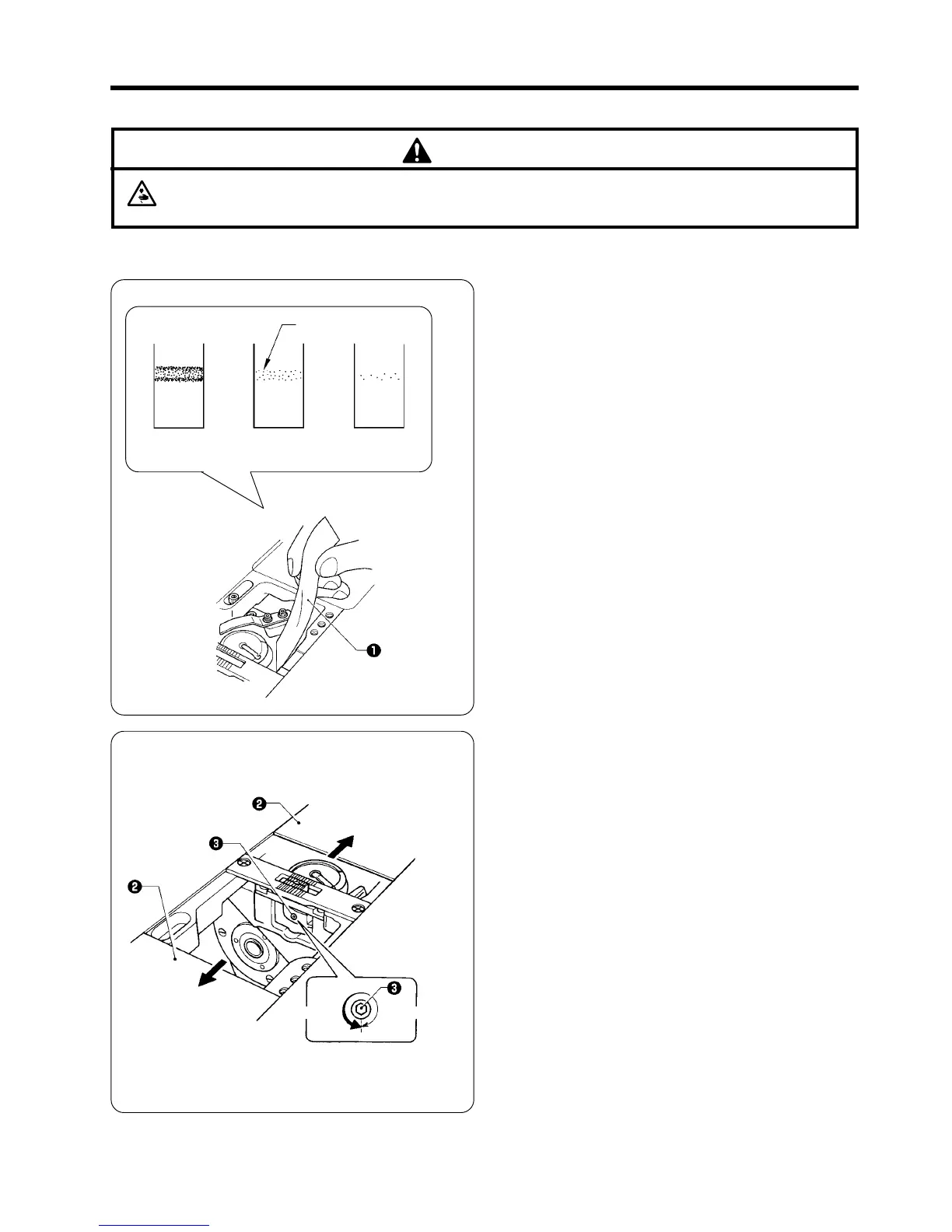 Al verificar la lubricación de la lanzadera, no se deben tocar las piezas móviles como la lanzadera, la aguja, la barra