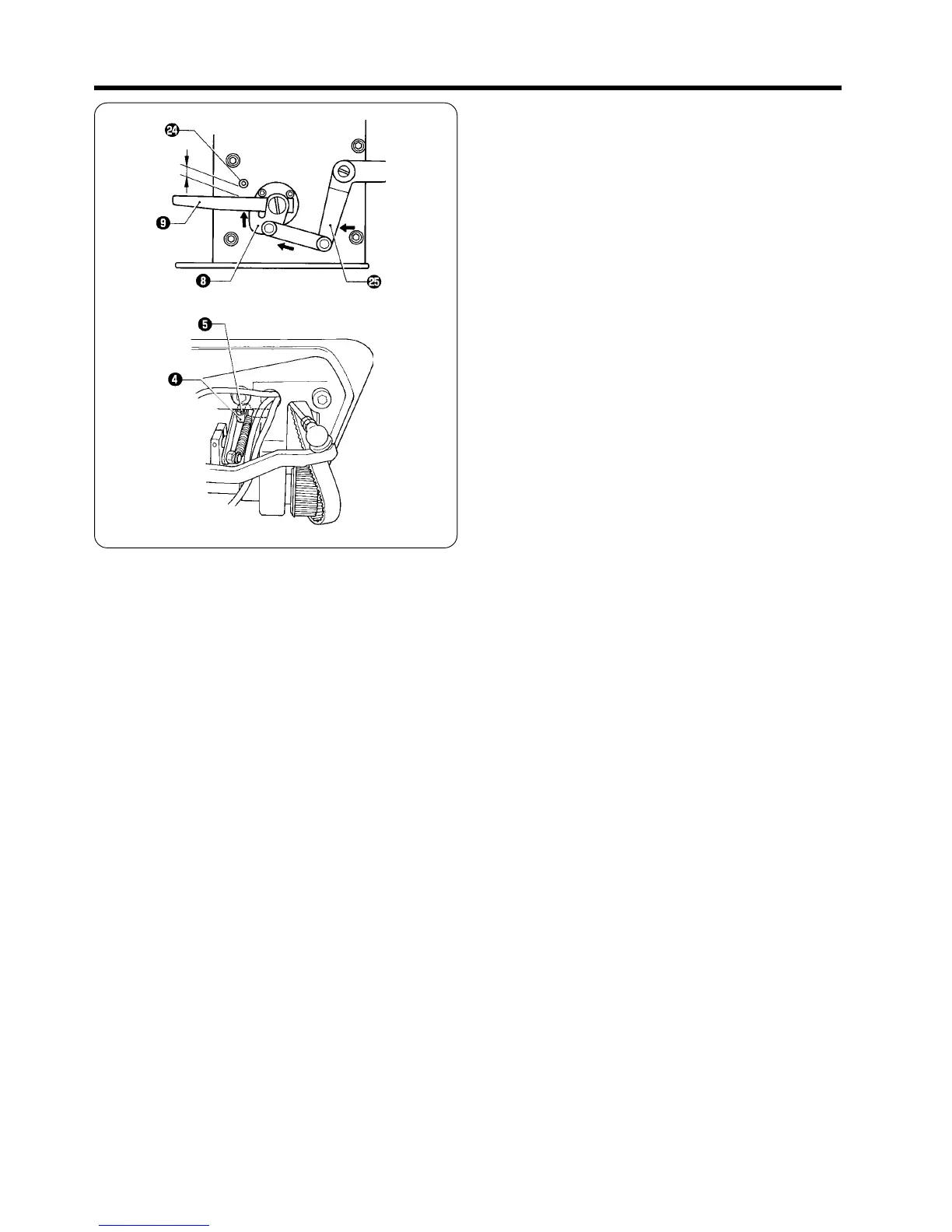 17.Régler l’écart entre le levier de couture inverse o et la broche d’arrêt U @4 à 9,3 mm, puis poussser la plaque de connexion BT