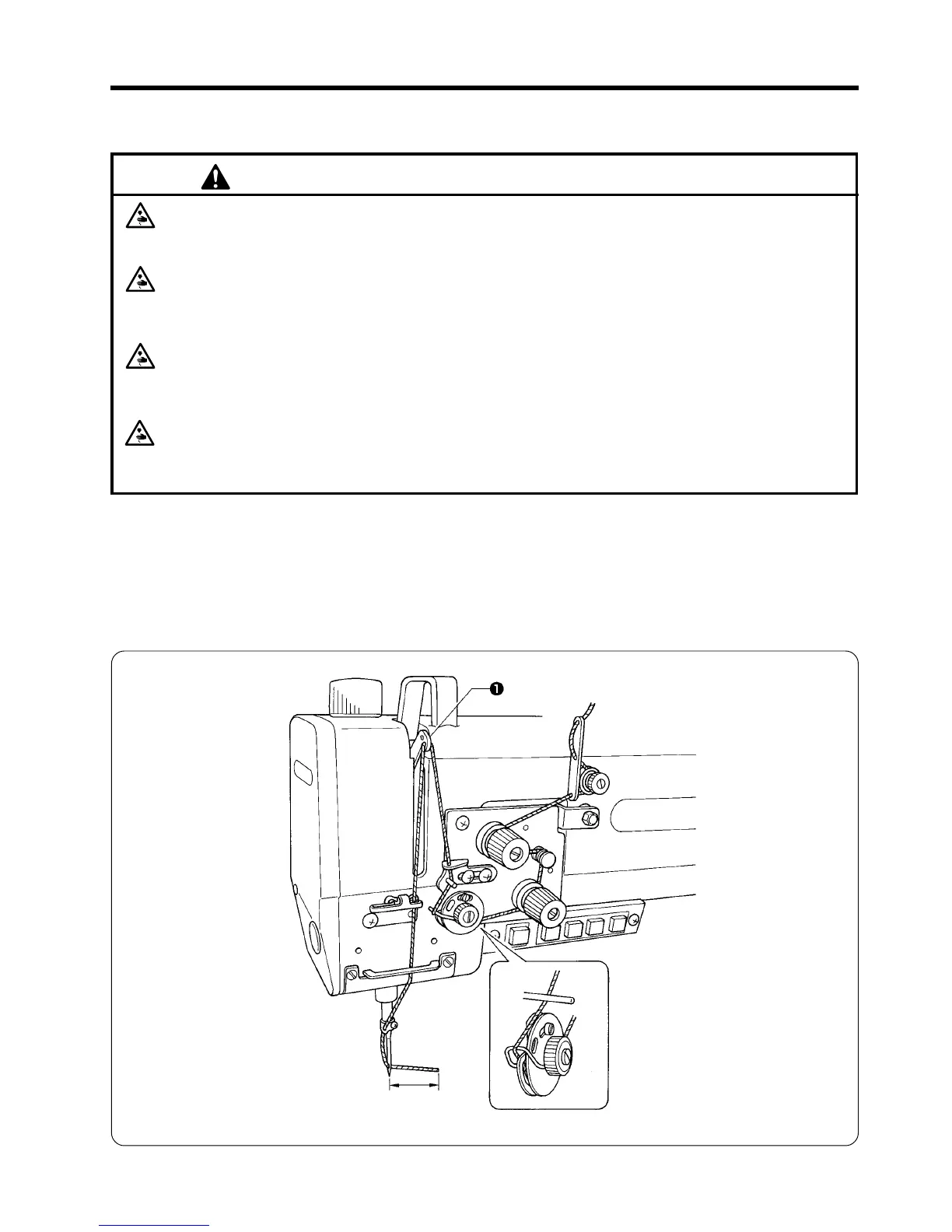 Turn off the power switch before threading the upper thread, otherwise the machine may operate if the treadle is