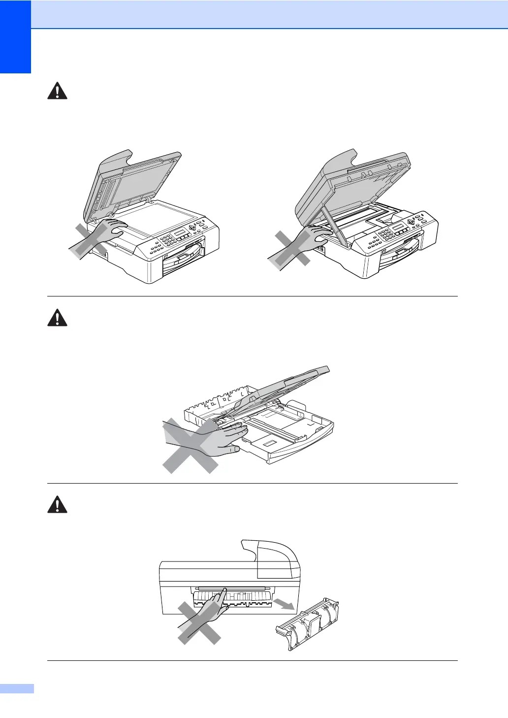 DO NOT put your hands on the edge of the machine under the document cover or the scanner