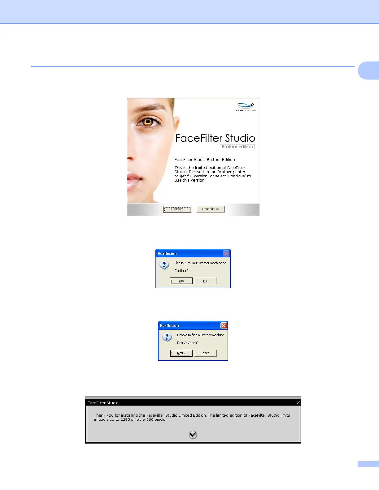 a When you launch FaceFilter Studio for the first time, if your Brother machine is turned Off or not