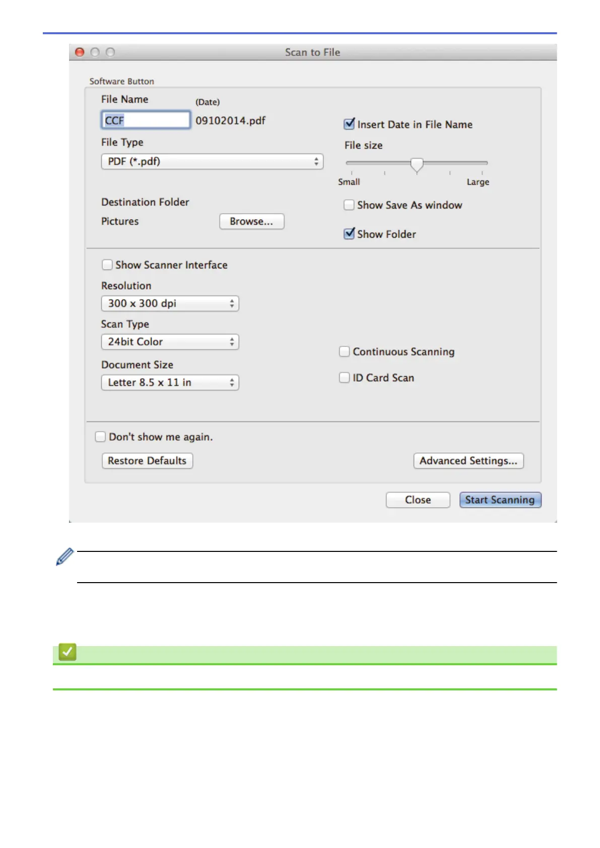 6. Change the scan settings, such as file format, file name, destination folder, resolution, or color, if needed.