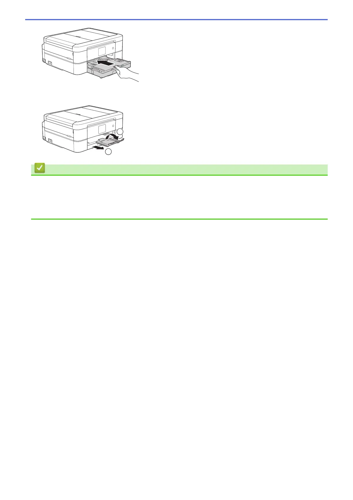 9. While holding the paper tray in the machine, pull out the paper support (1) until it locks into place, and then