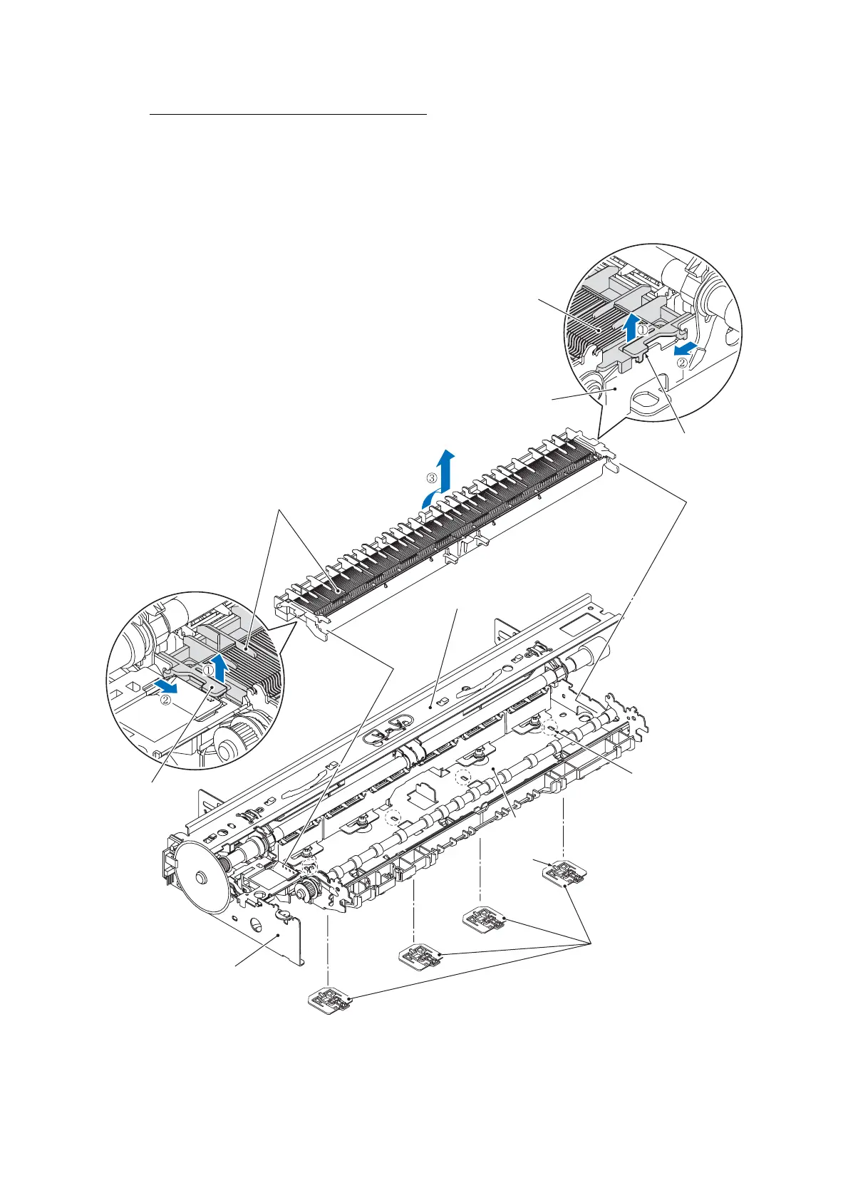 (16)At each of the four DX chute roller holder ASSYs, press down its boss which is fitted in the