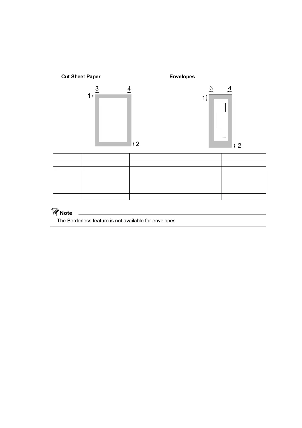 show the unprintable areas on cut sheet paper and envelopes. The machine can print in the