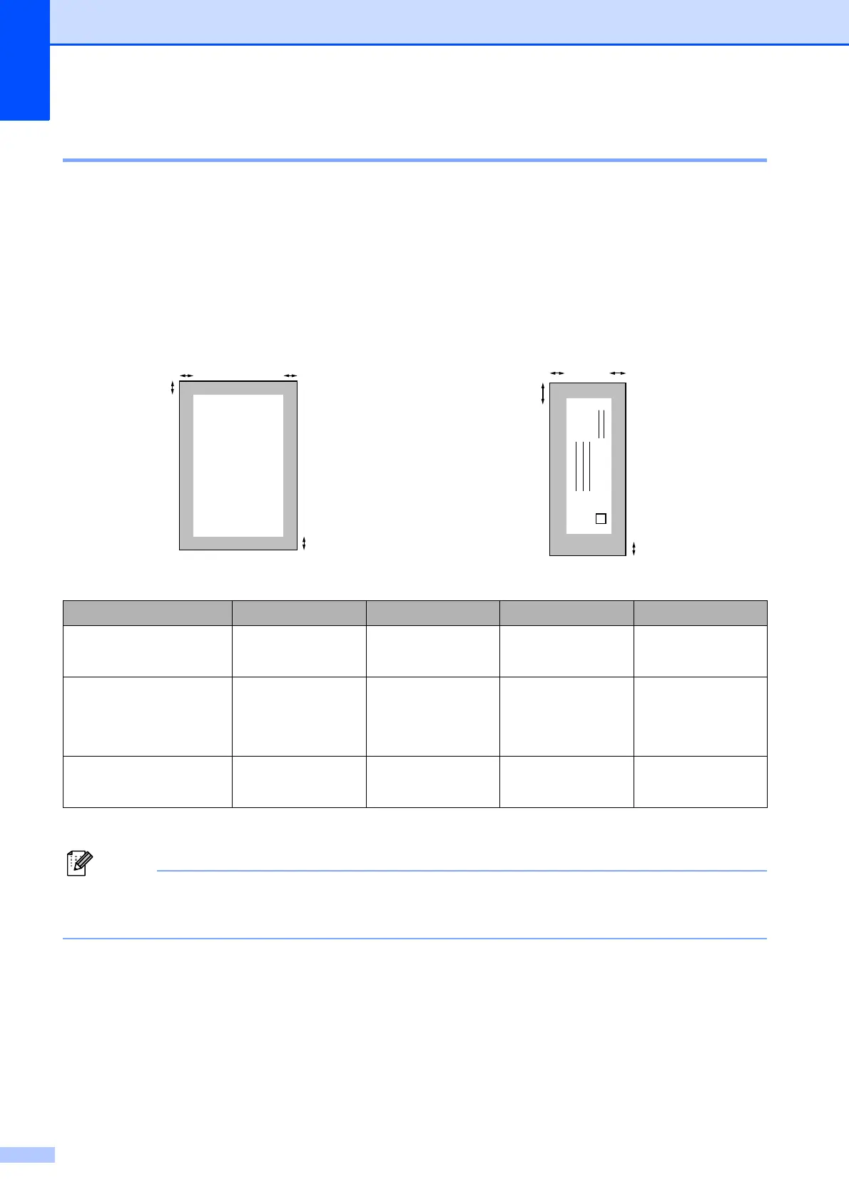 show the unprintable areas on cut sheet paper and envelopes. The machine can print in the