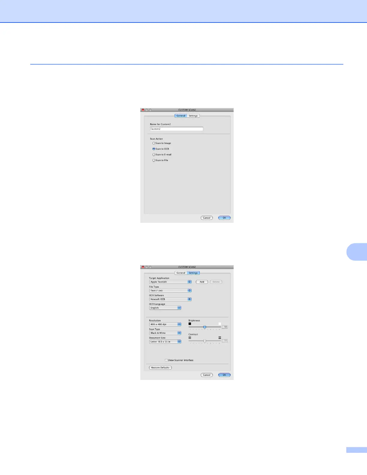 Document Size, Show Scanner Interface, Brightness and Contrast settings.