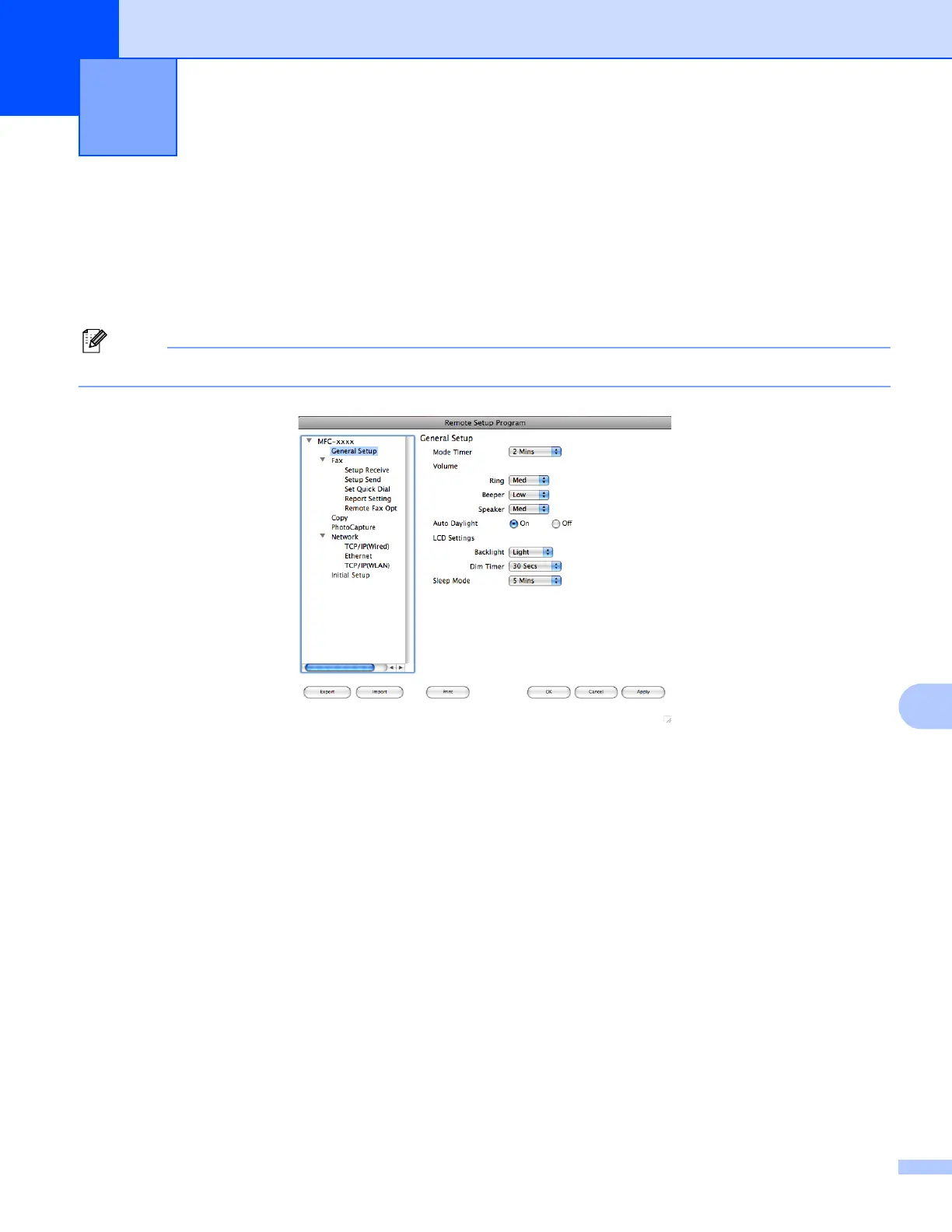 The Remote Setup application lets you configure many machine settings from a Macintosh application.