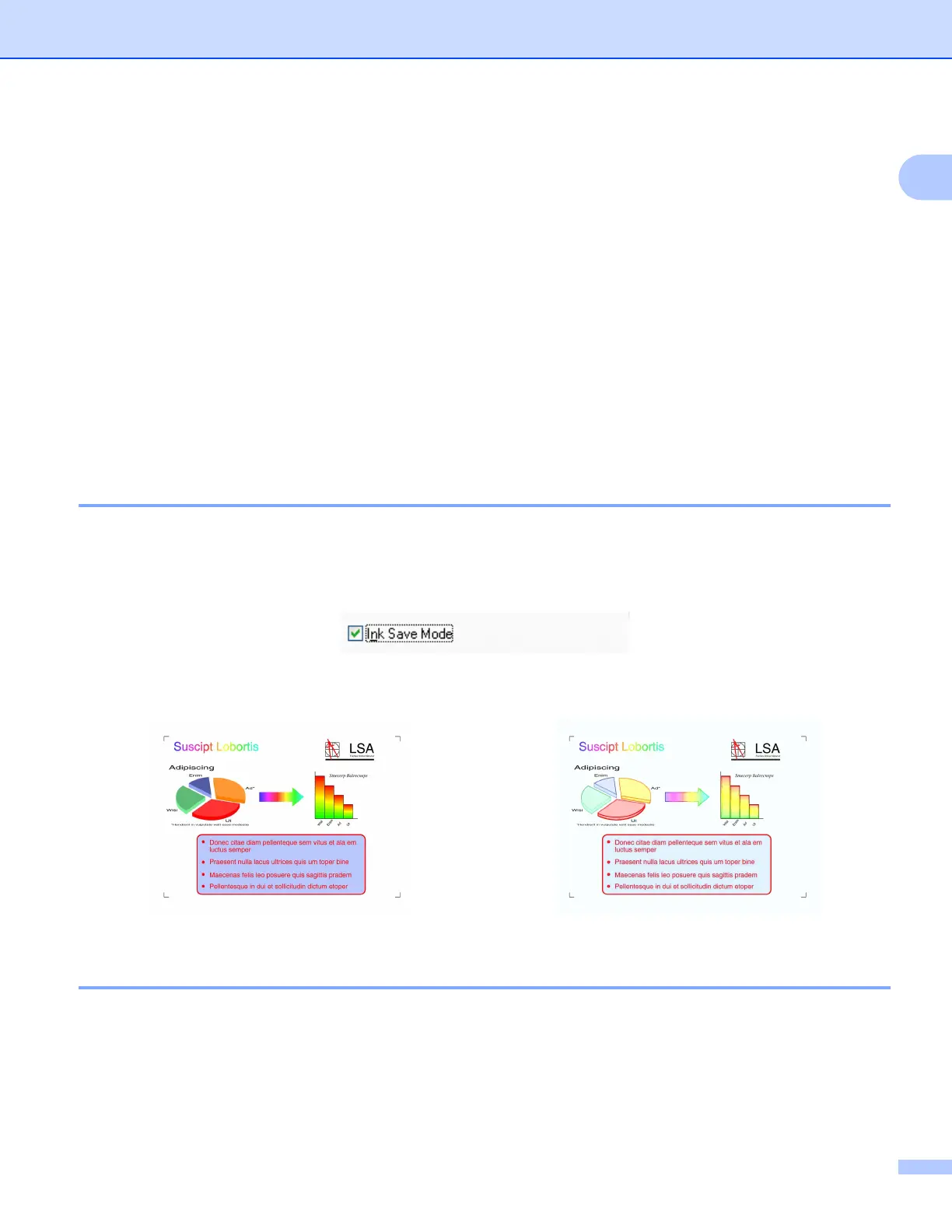 When you choose Ink Save Mode, the machine prints the colors lighter and emphasizes the outlines of the
