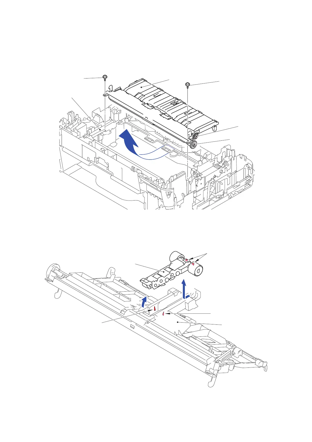 (2) Release the four Hooks and remove the Paper pull-in roller holder from the DX chute.