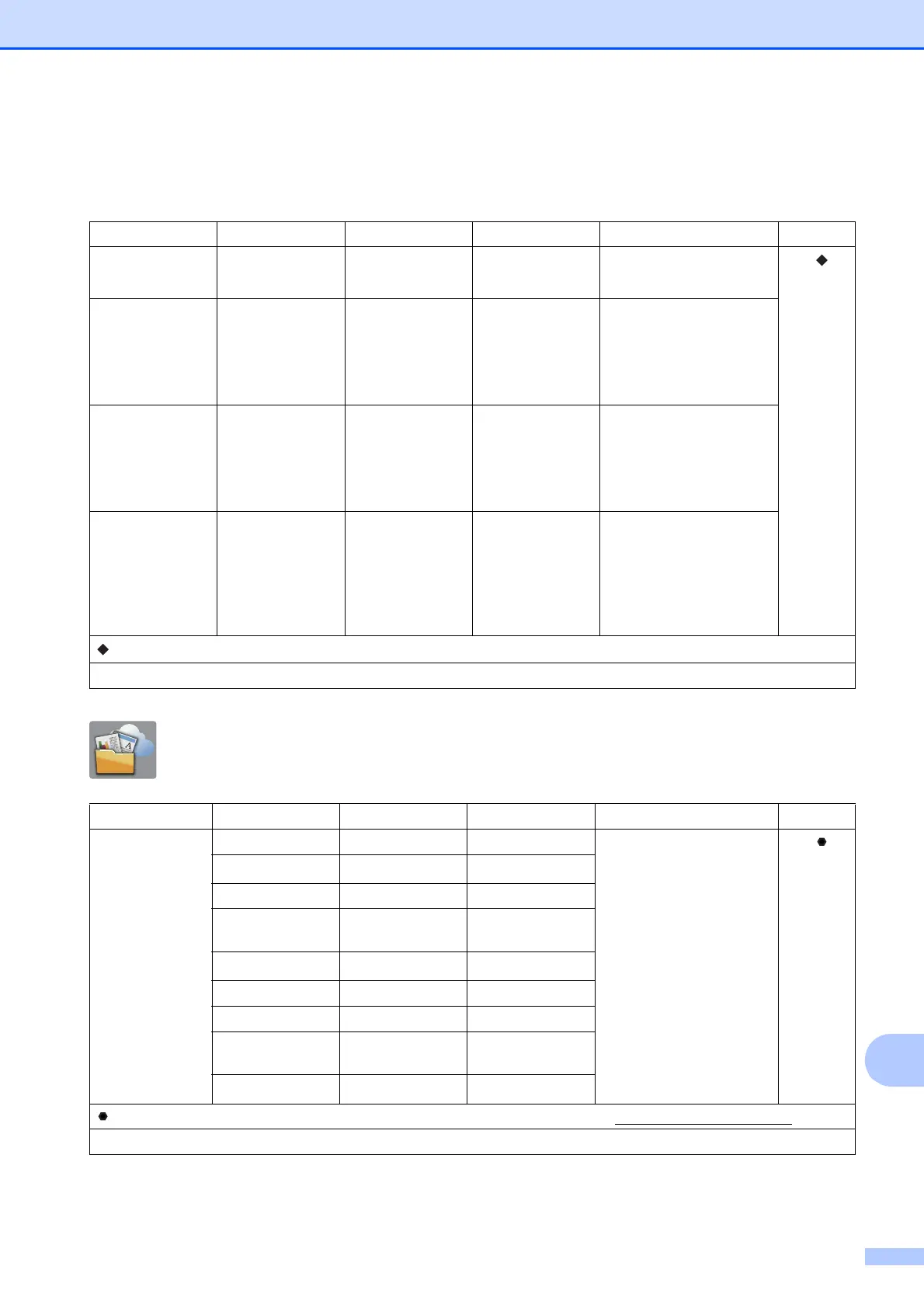 Settings and features tables