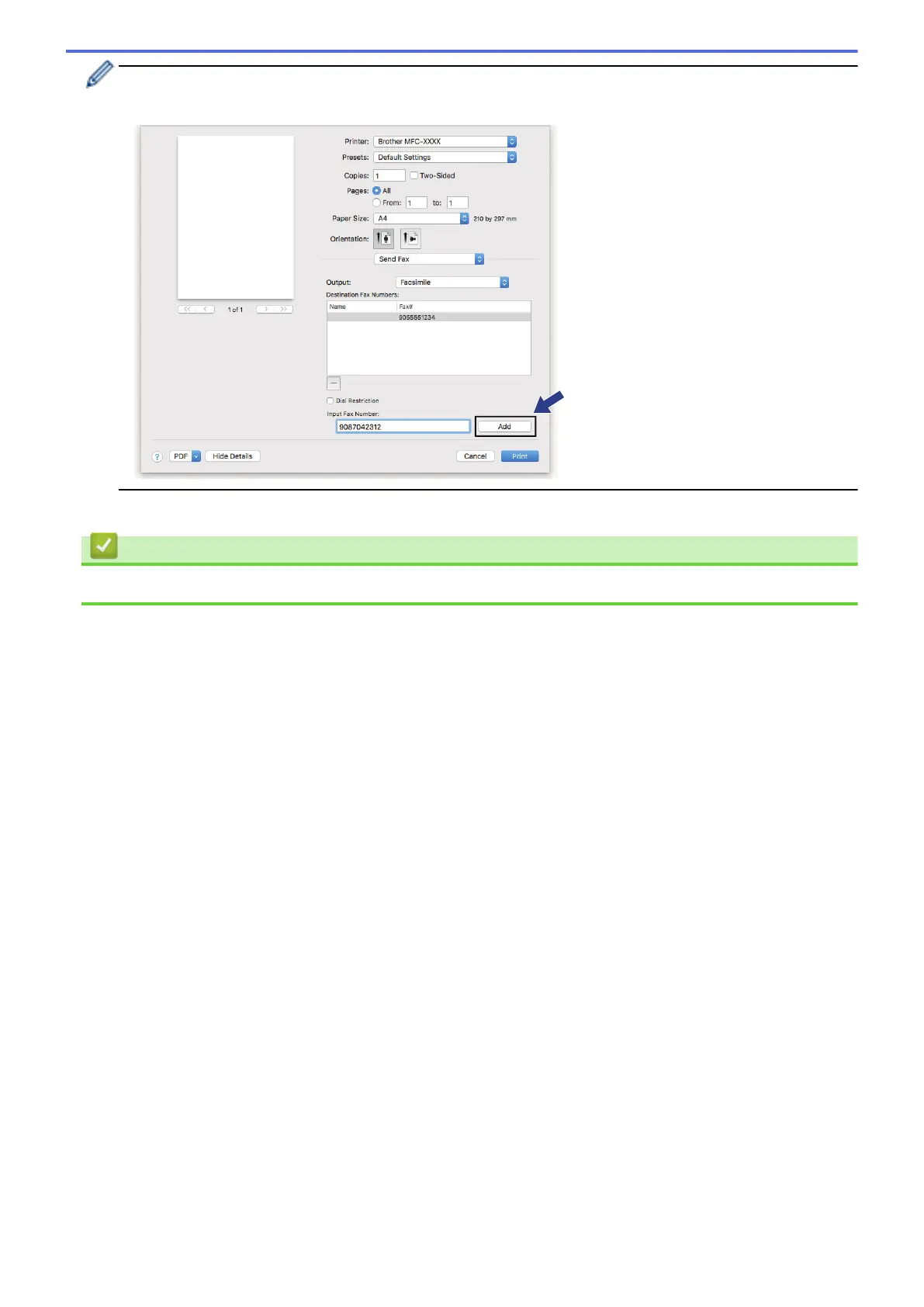 To send a fax to more than one number, click the Add button after entering the first fax number and type
