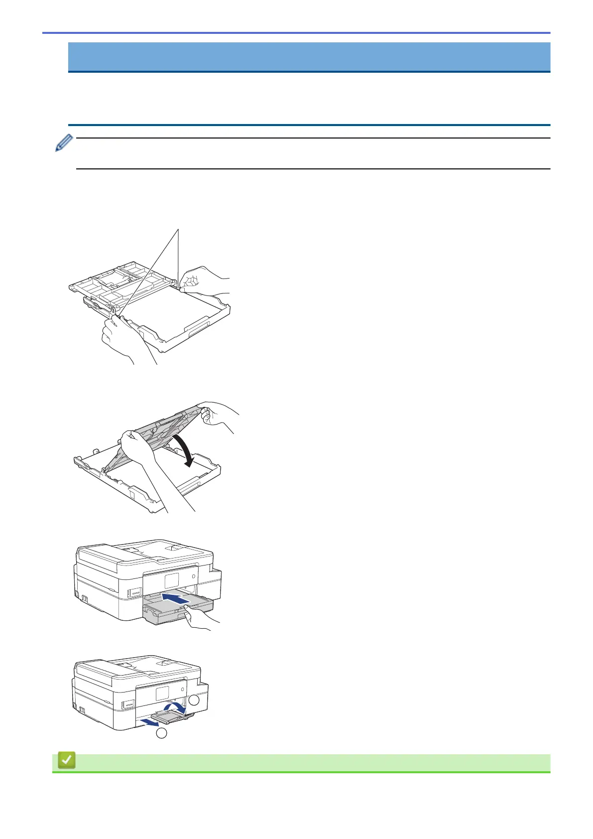 10. Pull out the paper support (1) until it locks into place, and then unfold the paper support flap (2).