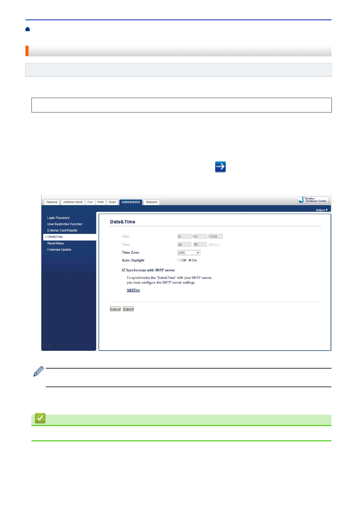 Configure date and time to synchronize the time used by the machine with the SNTP time server.