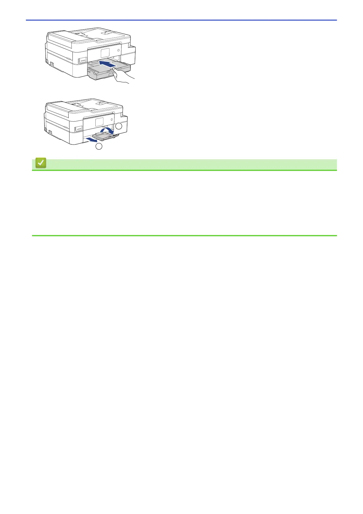 8. Pull out the paper support (1) until it locks into place, and then unfold the paper support flap (2).