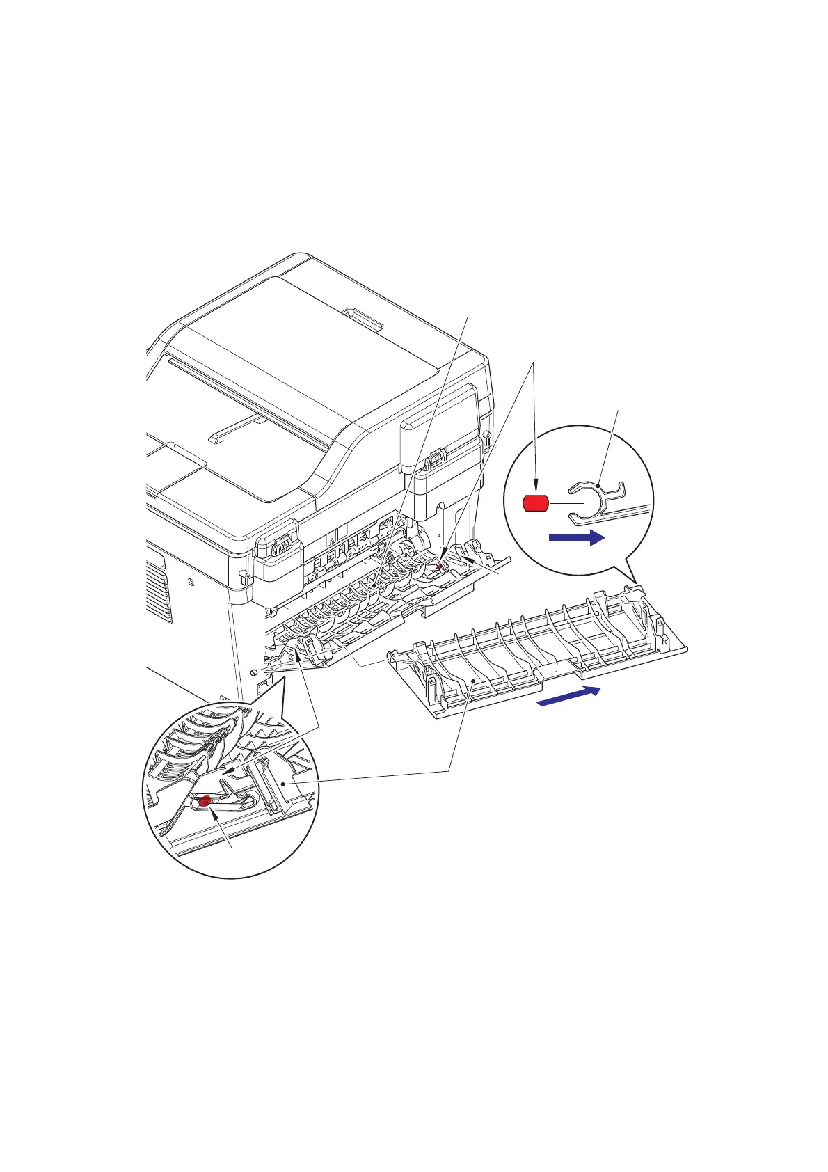 (2) Push both ribs on the back cover outward, and remove the pins on the outer chute