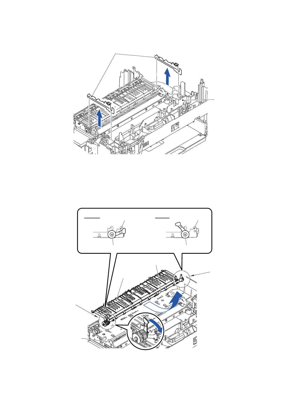 Assembling Note: Mount the Paper ejection roller with its bushing lever tilted forward