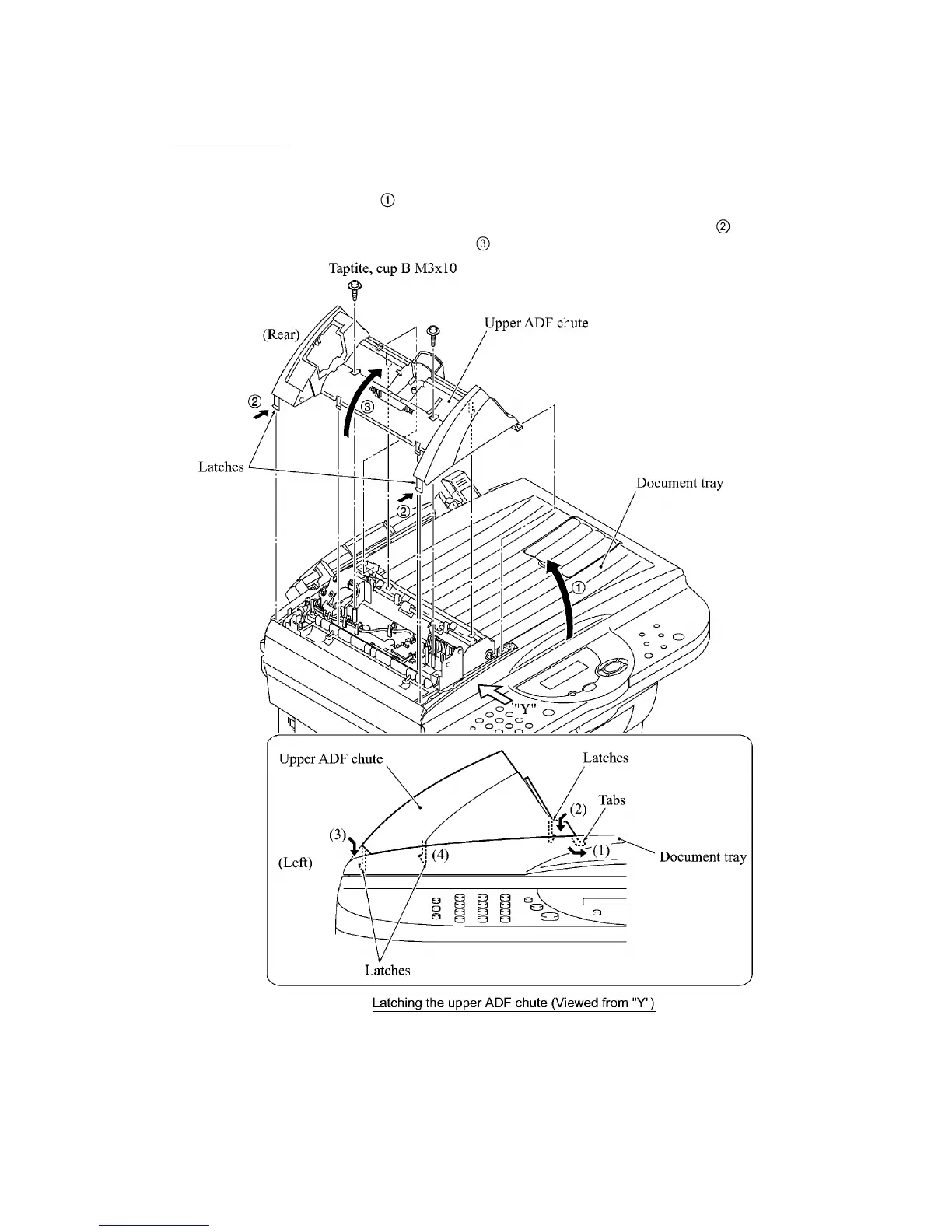 Reassembling Note: When latching the upper ADF chute, first fit tabs (1) of the right end
