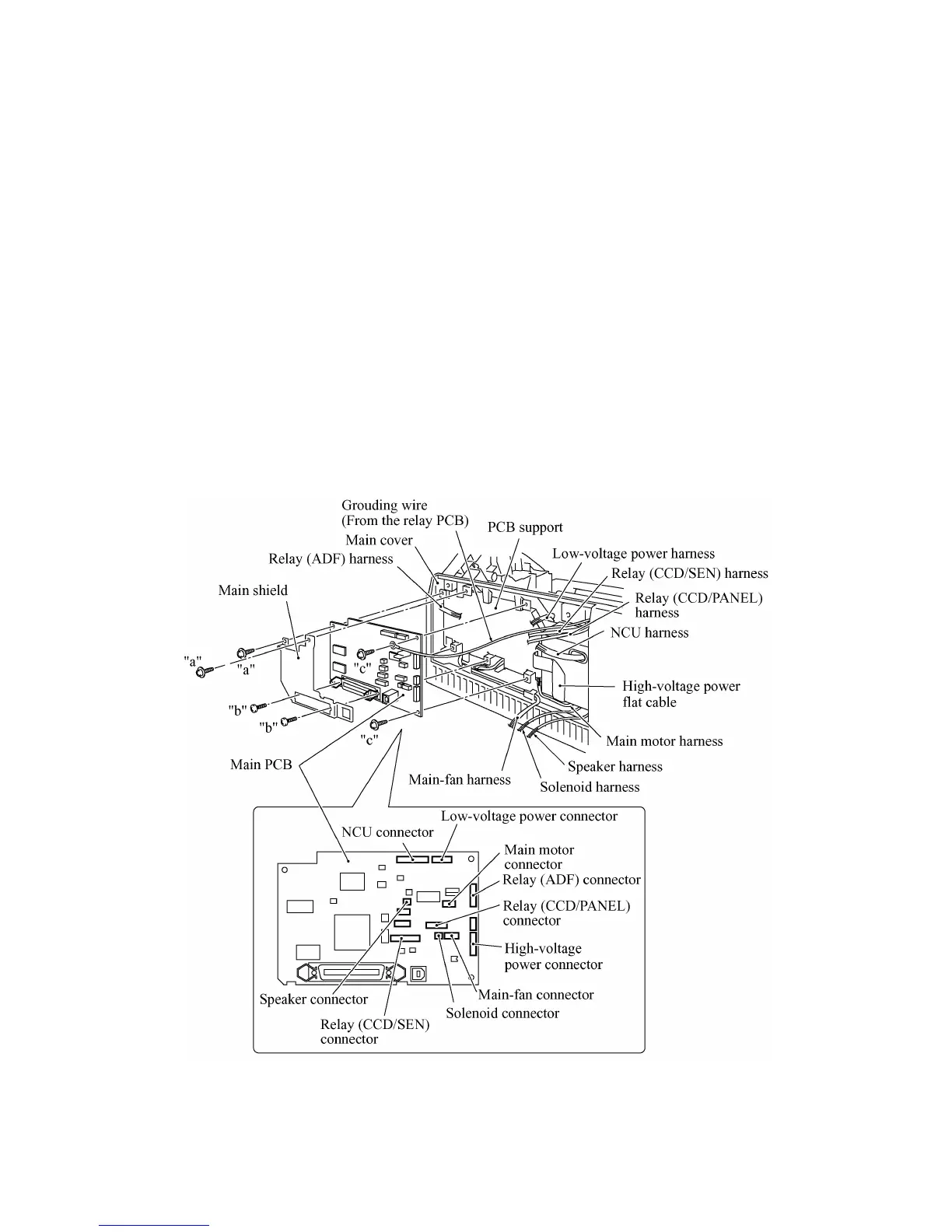 (4) Remove two screws "c" from the main PCB and then take it off from the PCB support. The