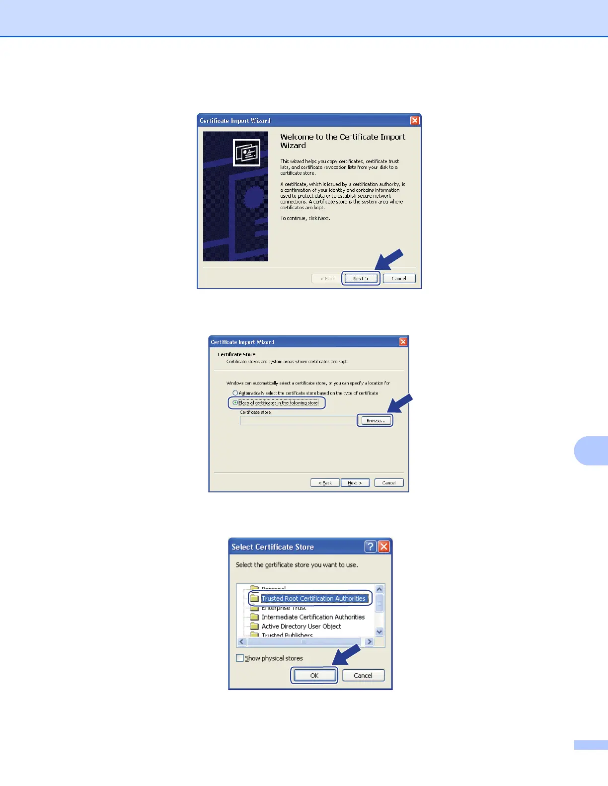 f Choose Place all certificates in the following store and then, click Browse....