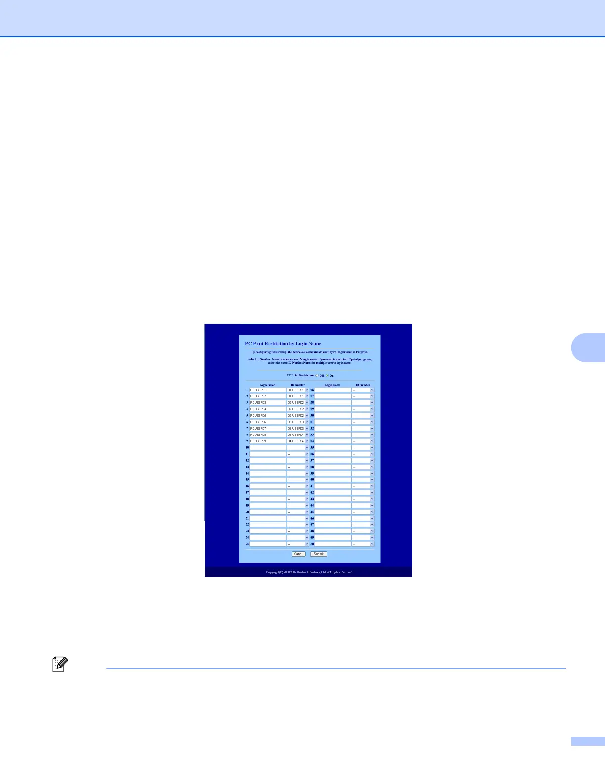 • If you want to restrict PC print per group, choose the same ID Number for each PC login name you want