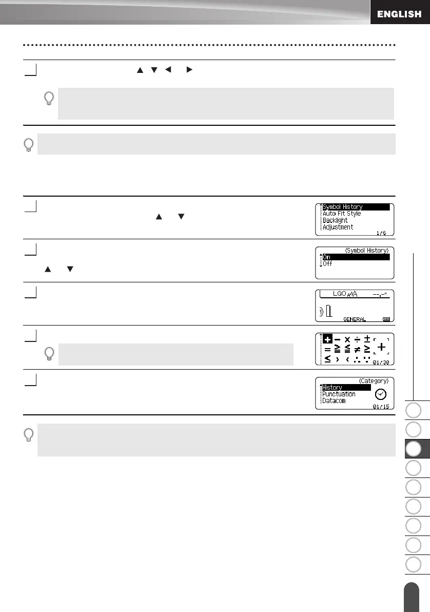 • To stop using the Symbol History, select "Off" in the Symbol History screen.
