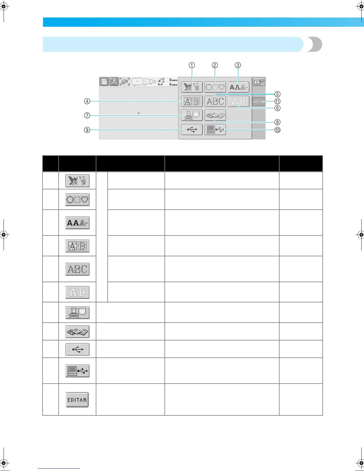 9 Tecla de dispositivo USB Recupera diseños desde el dispositivo USB. p.117