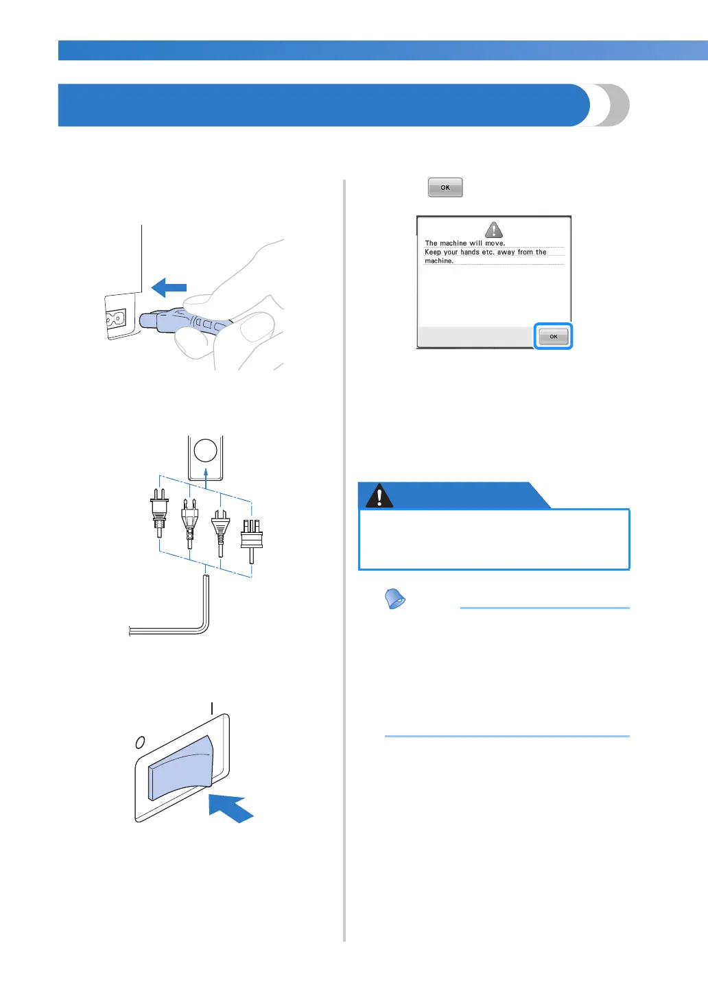 Connect the power supply cord, and then turn on the embroidery machine. For precautions concerning the