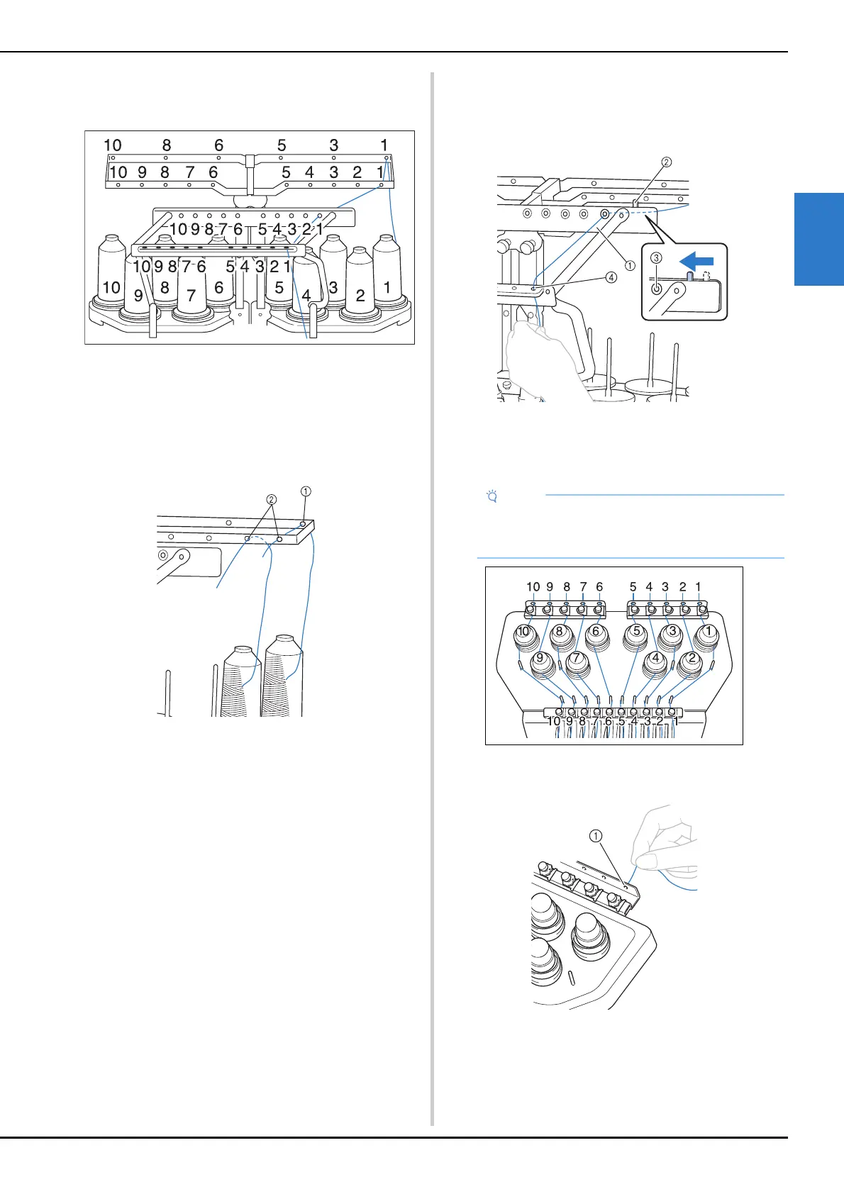 Pass the thread from spool pins 1, 3, 5, 6, 8 and 10