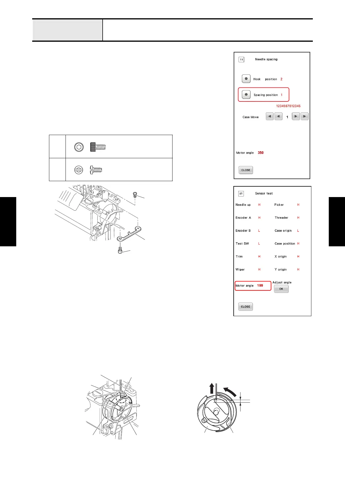 • The “Motor angle” will equal 199 when the needle bar is raised between 1.8 and 2.2 mm from its lowest point.