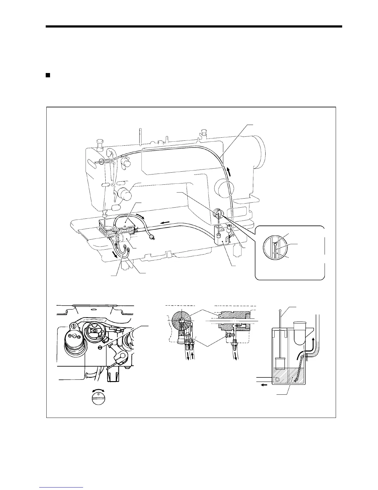 3. The lubricating oil in the sub tank (5) is transferred to parts such as the thread take-up lever and needle bar by wicks.