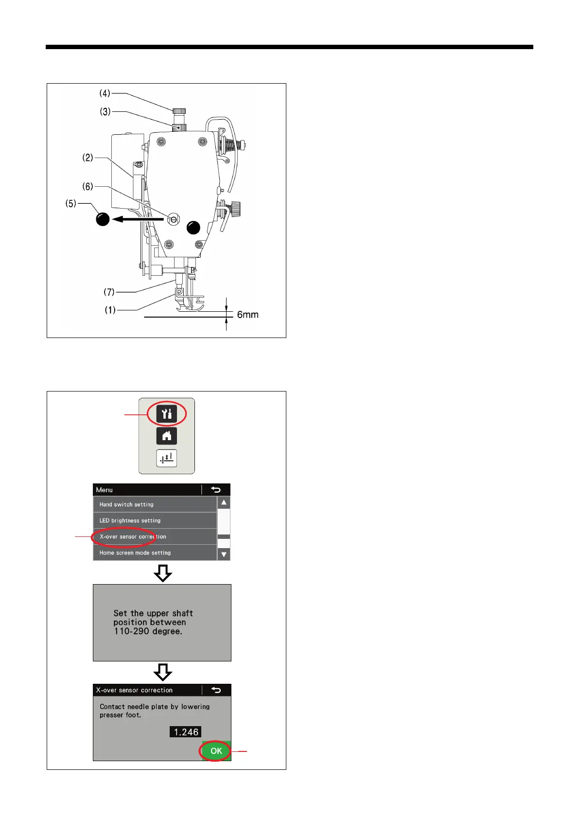 4. Loosen the bolt (6) and then move the presser bar (7) up