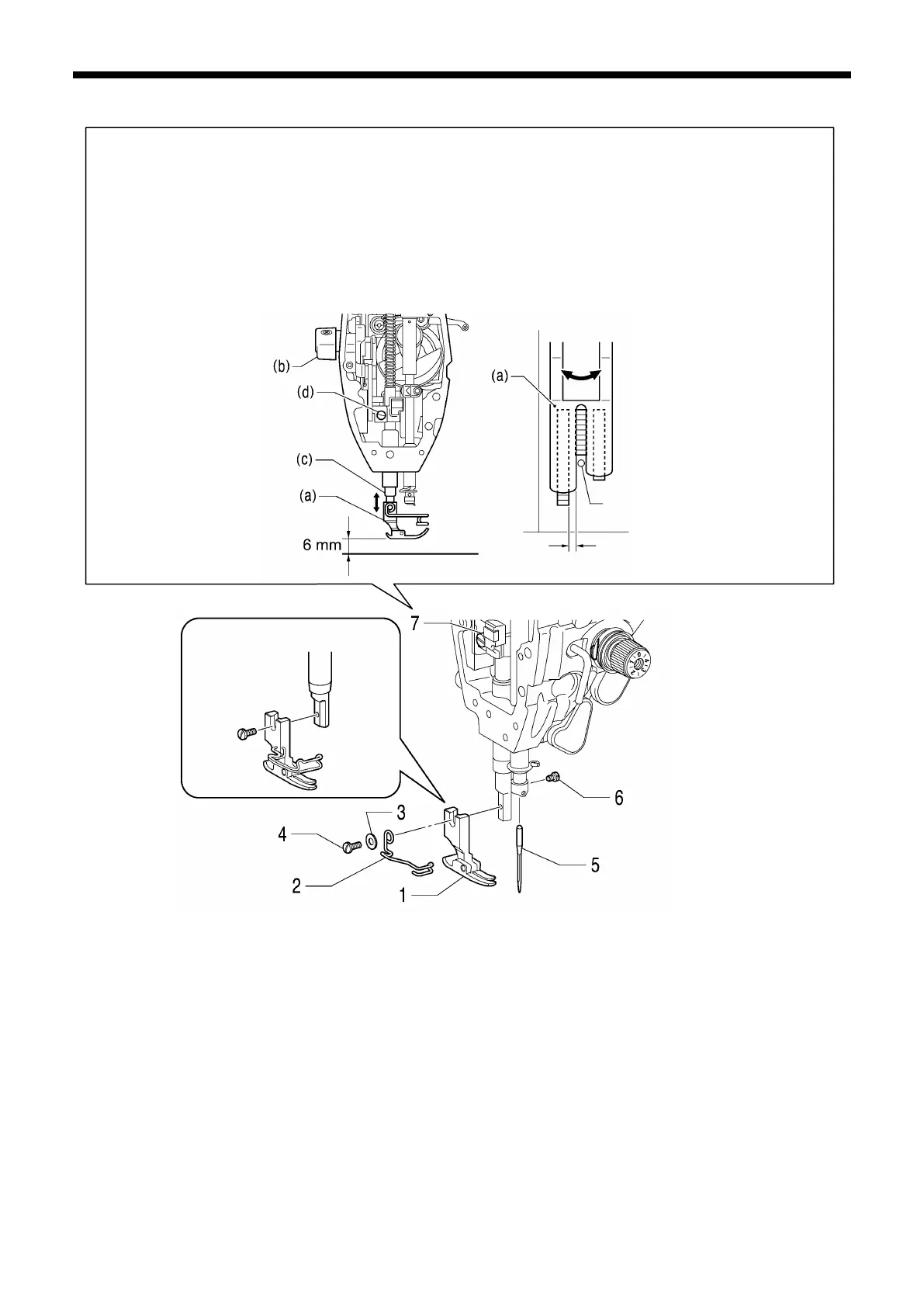 Move the presser bar (c) up or down to adjust the height of the presser foot (a) so that it is 6 mm above