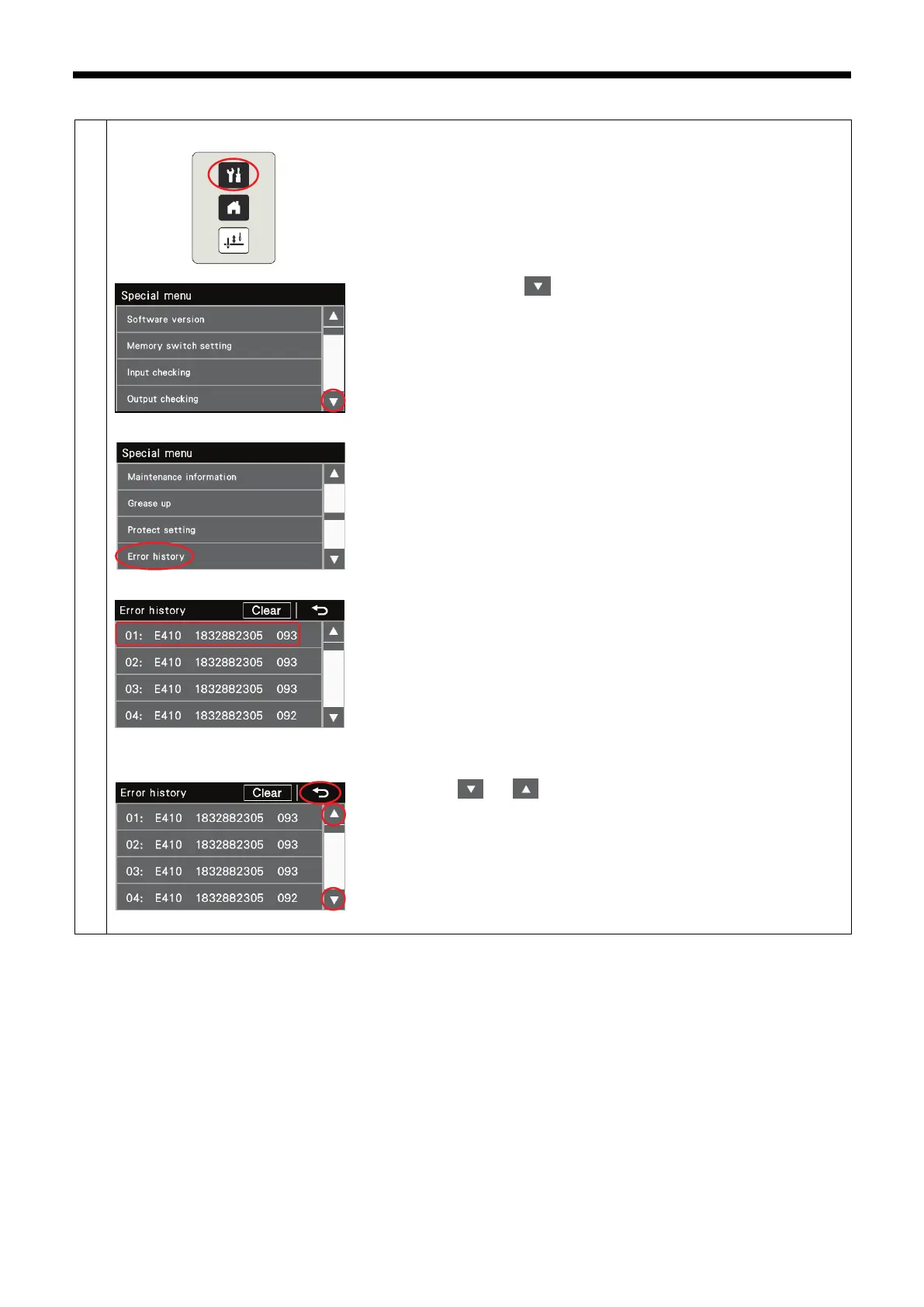 Up to 96 error items (01 - 96) are stored in order starting from the newest.