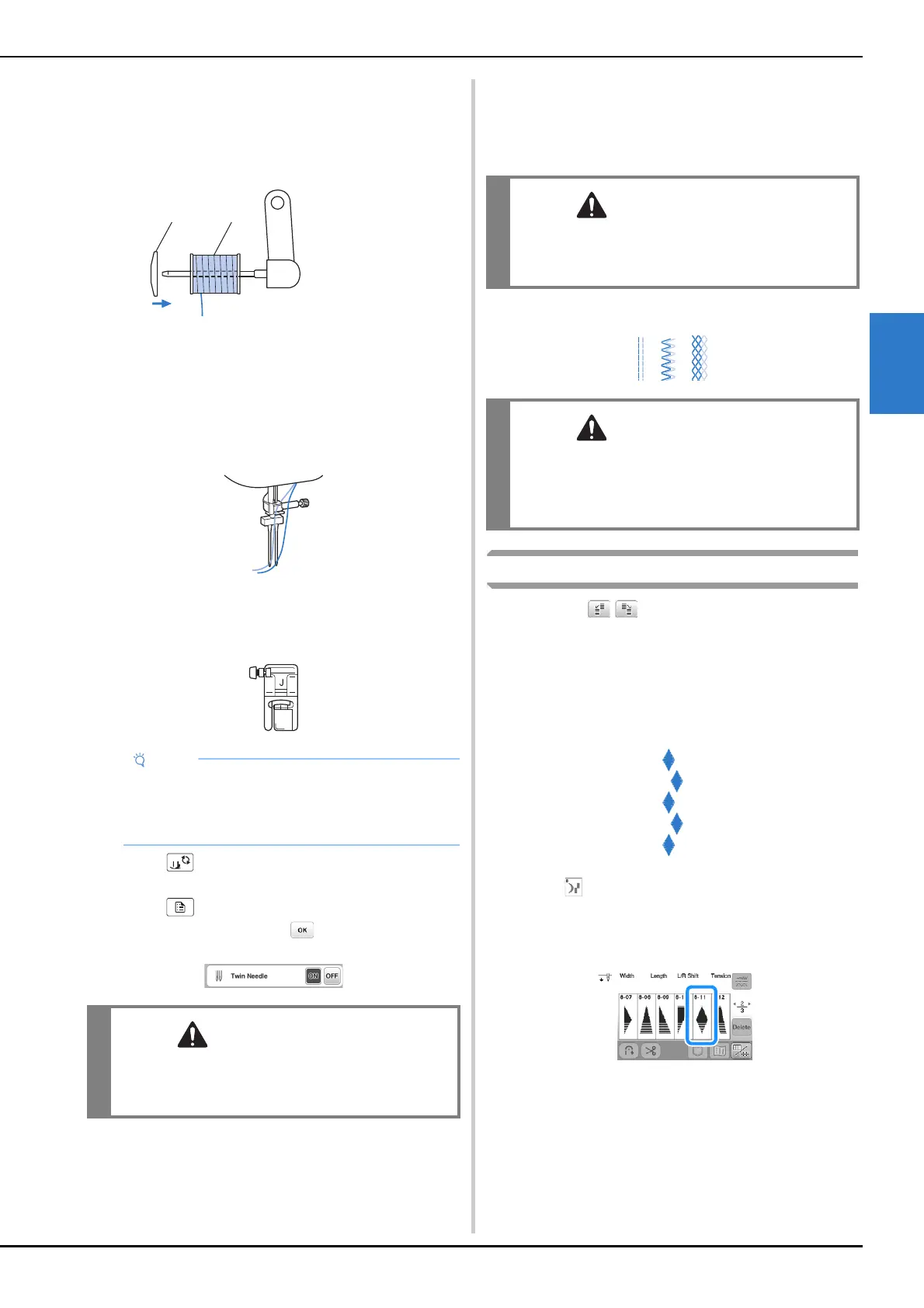 • When using the twin needle, be sure to select