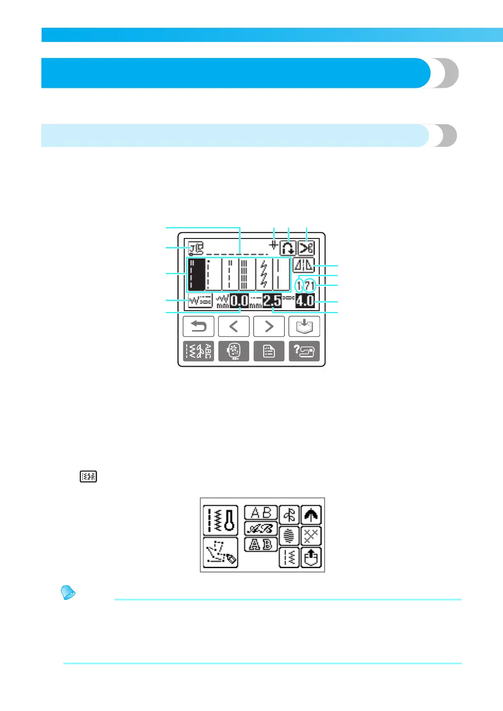 Selected stitch, pattern settings and messages are displayed on the LCD (liquid crystal display) on the front