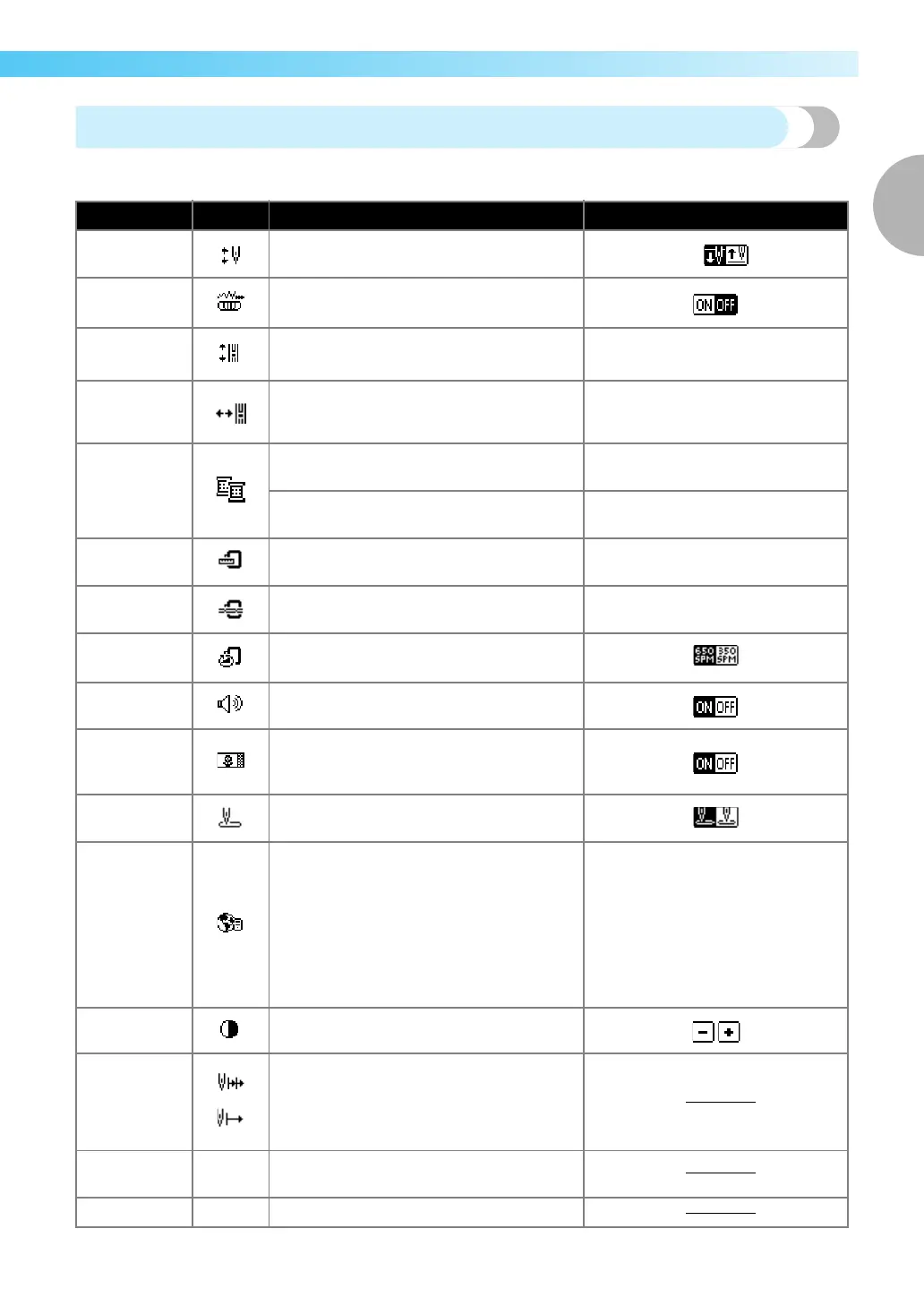 The stitch or machine attributes that can be set are listed below.