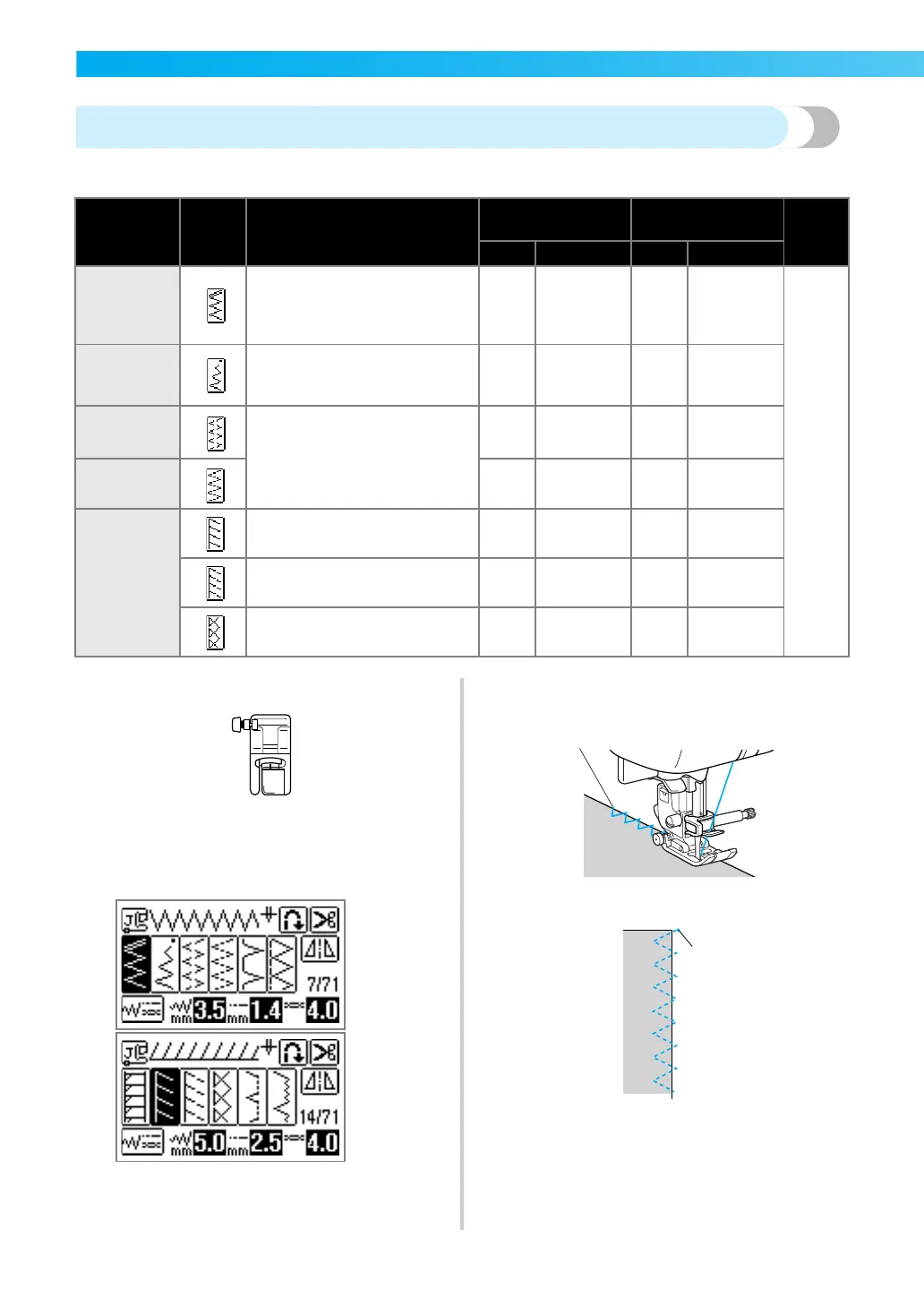 Seven stitches can be used to sew overcasting stitches with zigzag foot “J”.