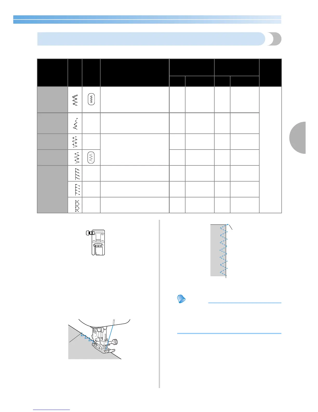 Seven stitches can be used to sew overcasting stitches with zigzag foot “J”.